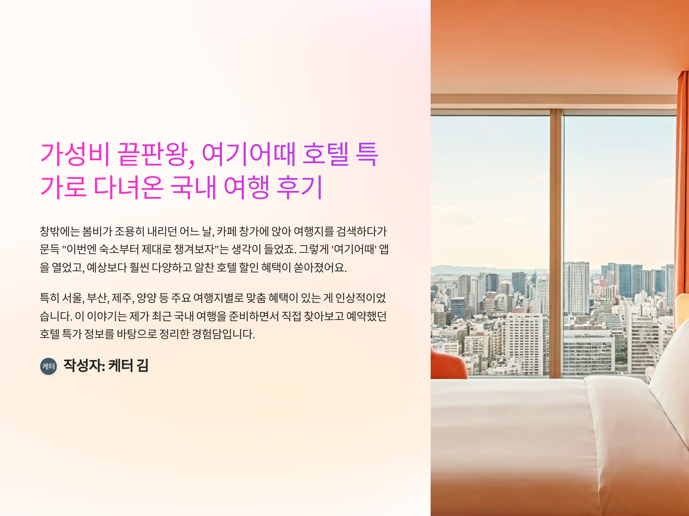 본 글은 광고를 포함하고 있습니다. [2025년 5월 호텔 예약 꿀팁] 호텔스컴바인 할인코드부터 트립닷컴, 라쿠텐, 아고다까지 차이점 총정리 5월 8일, 날씨가 참 좋아요. 바람은 선선하고 뒷산에서는 새가 지저귀고 있어서, 괜히 마음이 평화로워지는 그런 날이죠. 이런 날이면, ‘지금 당장이라도 어딘가 떠나고 싶다’는 생각이 절로 듭니다. 그래서 오늘은 여행 준비 중 가장 큰 비중을 차지하는 숙박 예약에 대한 이야기를 해볼까 해요. 특히 호텔스컴바인 할인코드와 다양한 예약 플랫폼의 차이점에 대해 정리해봤습니다. 호텔스컴바인 할인코드는 뭘까? 호텔스컴바인은 우리가 흔히 알고 있는 ‘예약 플랫폼’이 아니라, 가격 비교 플랫폼이에요. 트립닷컴, 아고다, 익스피디아 등 여러 사이트에서 제공하는 호텔 가격을 비..