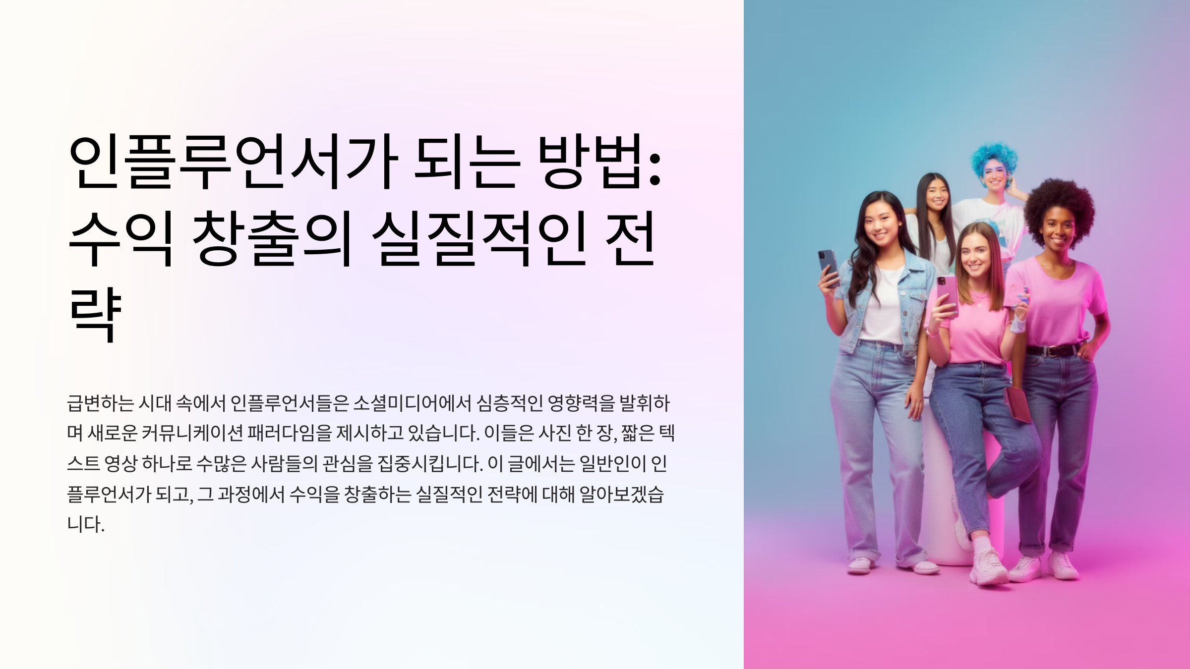 인플루언서가 되는 방법: 수익 창출의 실질적인 전략사진 한 장, 짧은 텍스트 영상 하나로 수많은 사람들의 관심을 집중시키는 '인플루언서'. 급변하는 시대 속에서 이들은 소셜미디어에서 심층적인 영향력을 exude하며 새로운 커뮤니케이션 패러다임을 제시하고 있습니다. 이번 글에서는 일반인에서 인플루언서가 되고, 그 과정에서 수익을 창출하는 실질적인 전략에 대해 알아보겠습니다. How to Become an Influencer 먼저, 인플루언서가 되기 위한 활동을 살펴보자면 가장 중요한 것은 '자신만의 명확한 브랜드 아이덴티티'를 찾는 것입니다. 본인의 취향, 성격, 경험 등을 반영한 독특한 컨텐츠를 통해 팔로워와 공감대를 형성하여 신뢰를 구축하는 과정이 중요합니다. 또한 일관된 스타일로 콘텐츠를 제작하고 ..