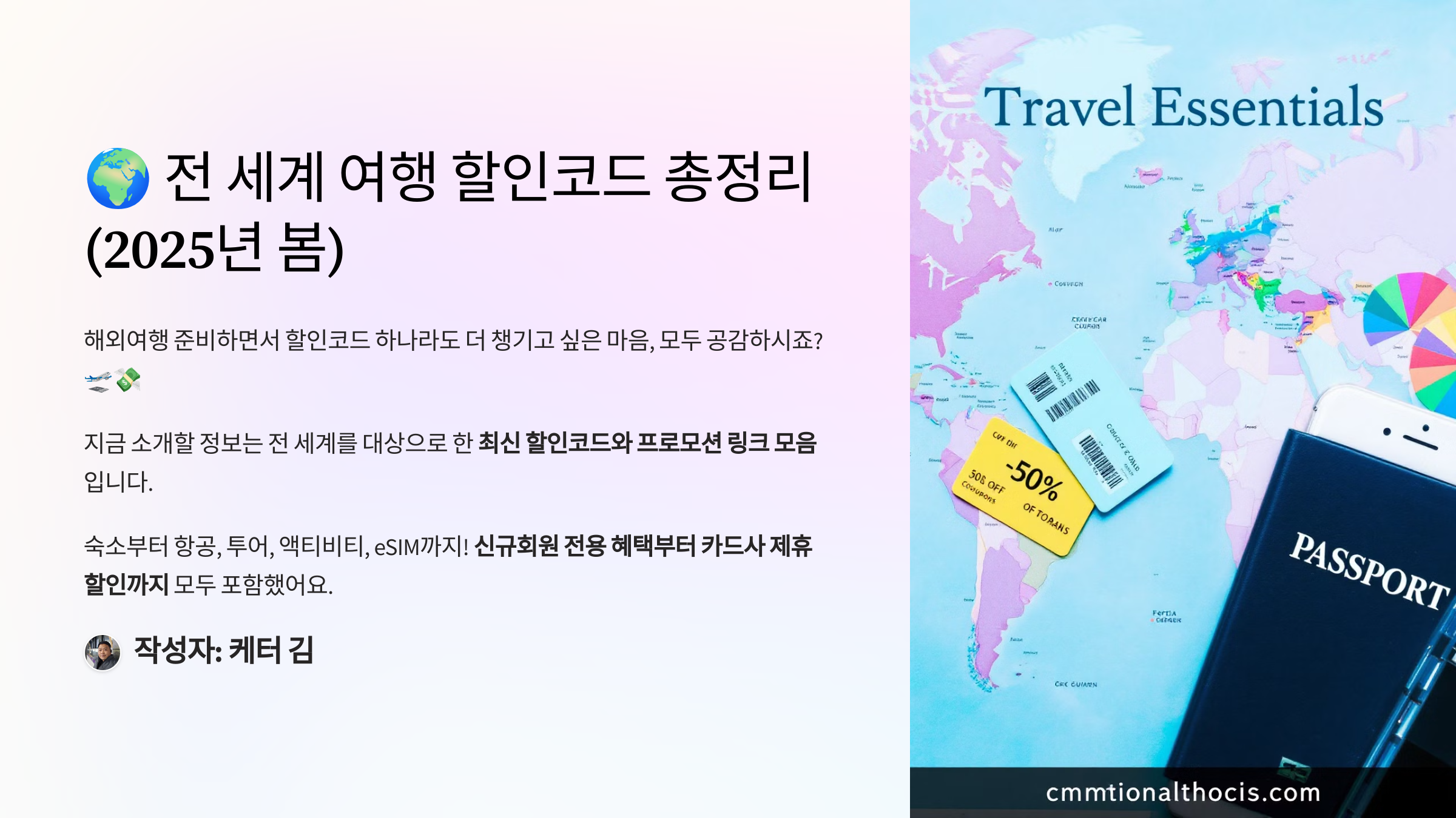 본 글은 광고를 포함하고 있습니다. 👍최신 할인코드 모음 사이트 : 할인코드.kr 해외여행 준비하면서 할인코드 하나라도 더 챙기고 싶은 마음, 모두 공감하시죠? 🛫💸지금 소개할 정보는 전 세계를 대상으로 한 최신 할인코드와 프로모션 링크 모음입니다. 숙소부터 항공, 투어, 액티비티, eSIM까지!신규회원 전용 혜택부터 카드사 제휴 할인까지 모두 포함했어요. 🧳 KKday 동남아/아시아 인기 티켓 & 액티비티 할인코드 추가✅ 동남아 인기 티켓/패스 할인 (2매 제공)1,000원 할인: 24KKSEA1 👉 바로가기5,000원 할인: 24KKSEA5 👉 바로가기10,000원 할인: 24KKSEA10 👉 바로가기✅ 푸꾸옥 썬월드 케이블카 전용 할인3000원 할인: 6RUA9CA 👉 바로가기혼똠..
