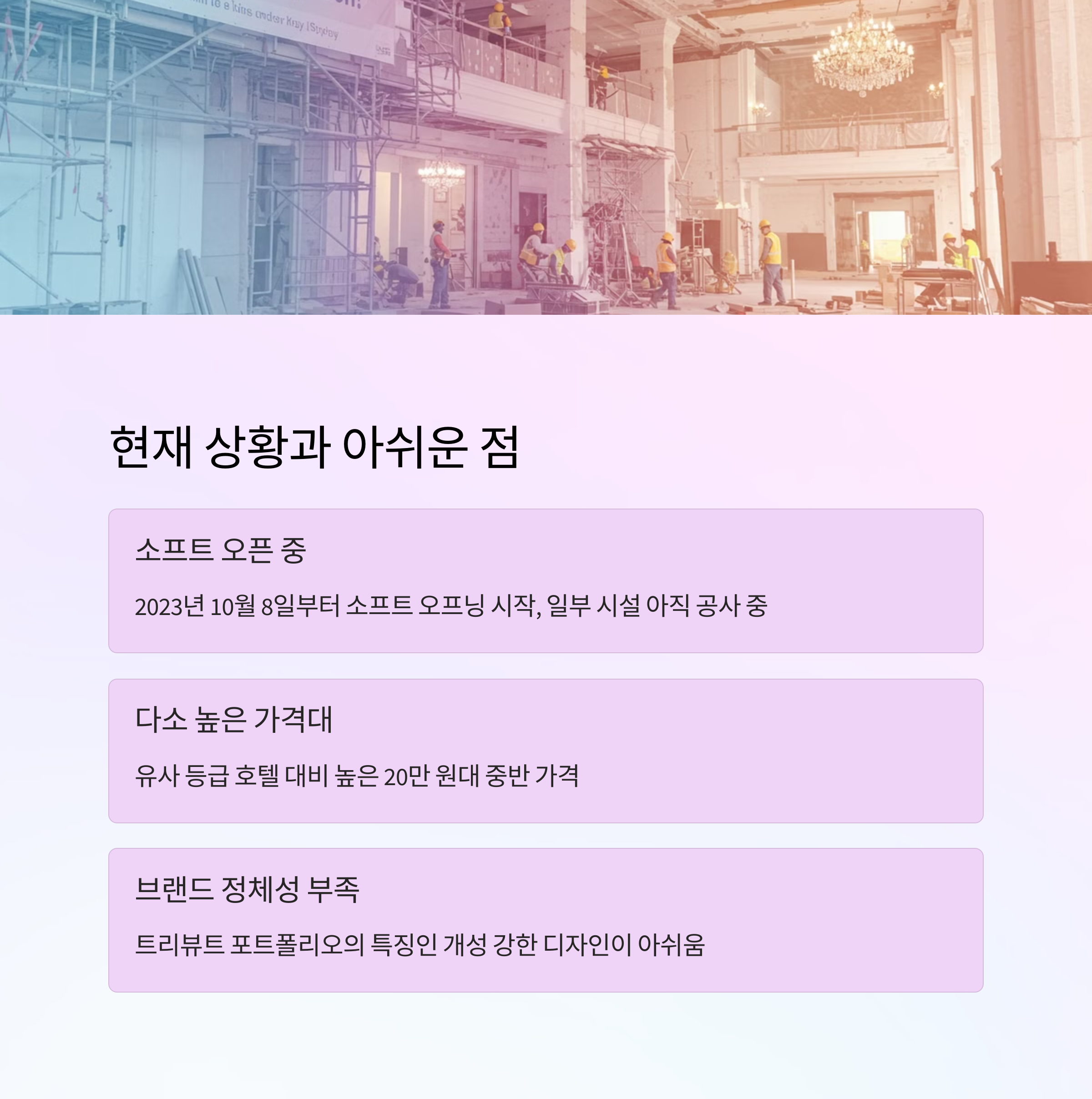 호텔 자체는 2023년 10월 8일에 소프트 오프닝을 시작했지만, 아직 모든 시설이 완공된 상태는 아닙니다. 현재 정상적으로 이용 가능한 곳은 레스토랑과 피트니스 센터 정도이며, 13층의 펀치 펍(Punch Pub) 과 실내 수영장, 주니어 스위트를 제외한 상위 스위트룸들은 아직 공사 중입니다.