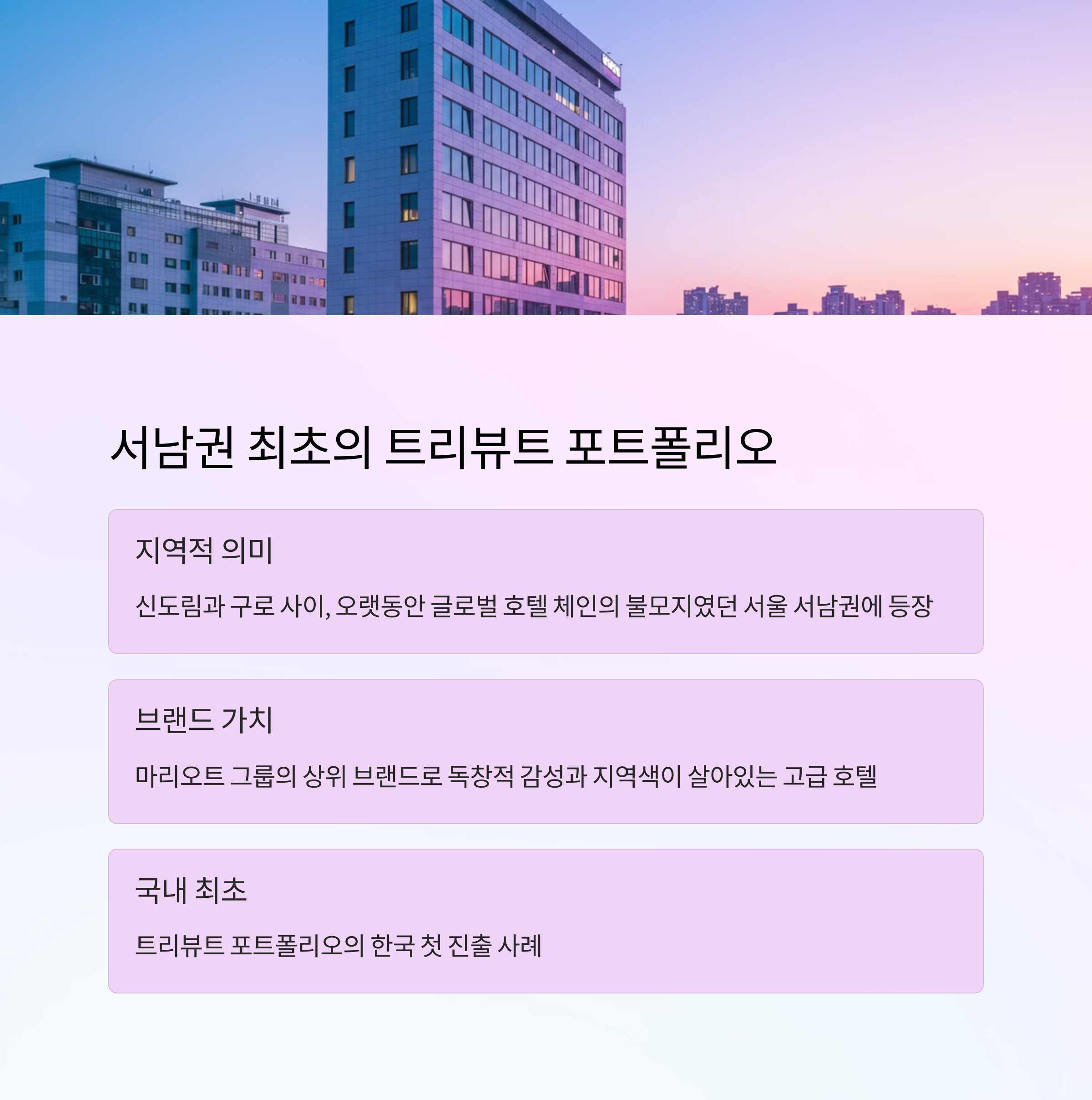 서울 서남권, 특히 신도림과 구로 사이 지역은 오랫동안 글로벌 호텔 체인의 불모지로 남아 있었죠. 한때 ‘쉐라톤 디큐브시티’와 ‘노보텔 독산’이 그 자리를 지켰지만, 문을 닫은 이후 이 지역에서 고급 호텔을 찾기란 쉽지 않았습니다. 그런데 드디어, 마리오트 계열의 ‘트리뷰트 포트폴리오(The Tribute Portfolio)’가 서울 서남권에 상륙했습니다. 그것도 국내 최초로 말이죠.