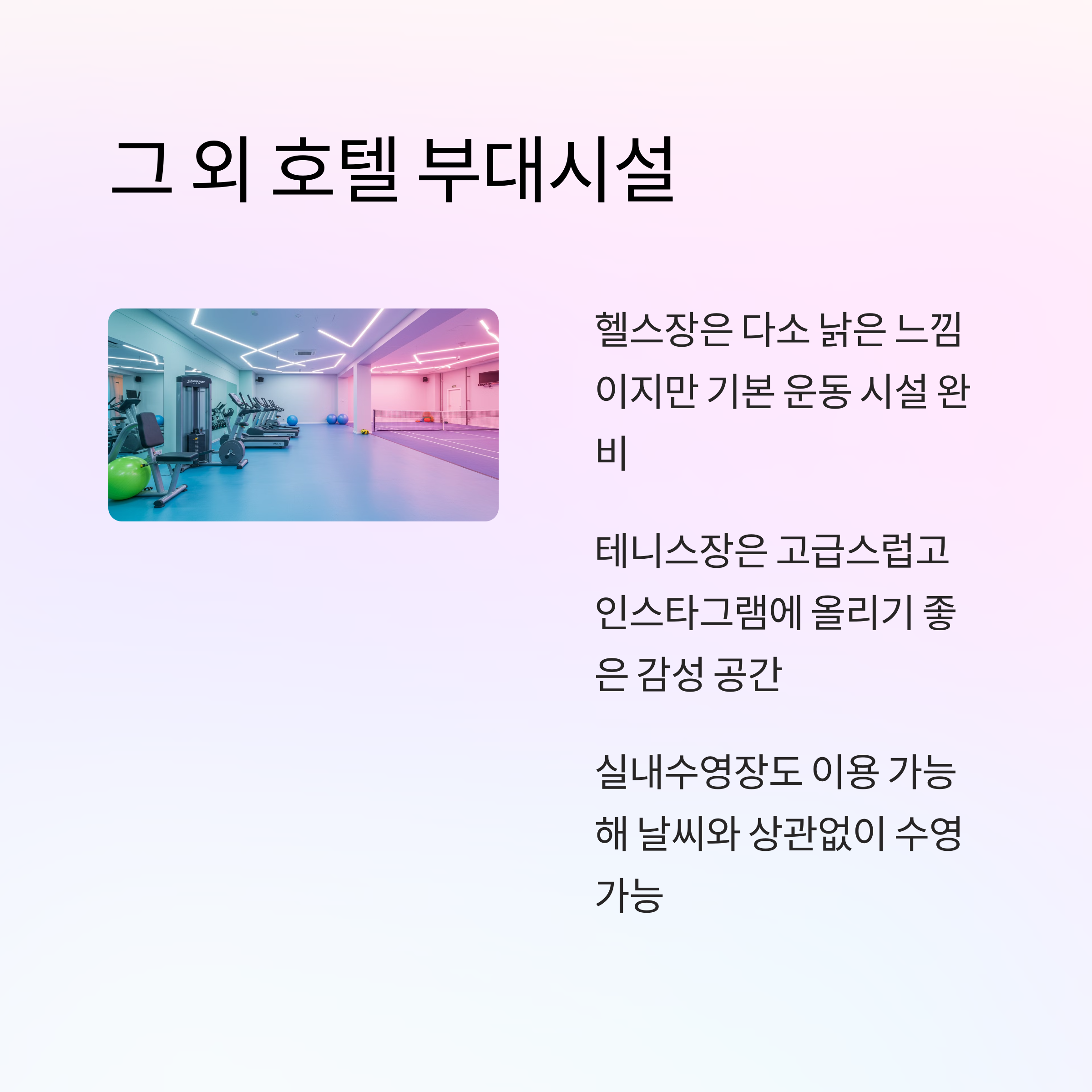 그 외 시설들 – 헬스장, 실내수영장, 테니스장