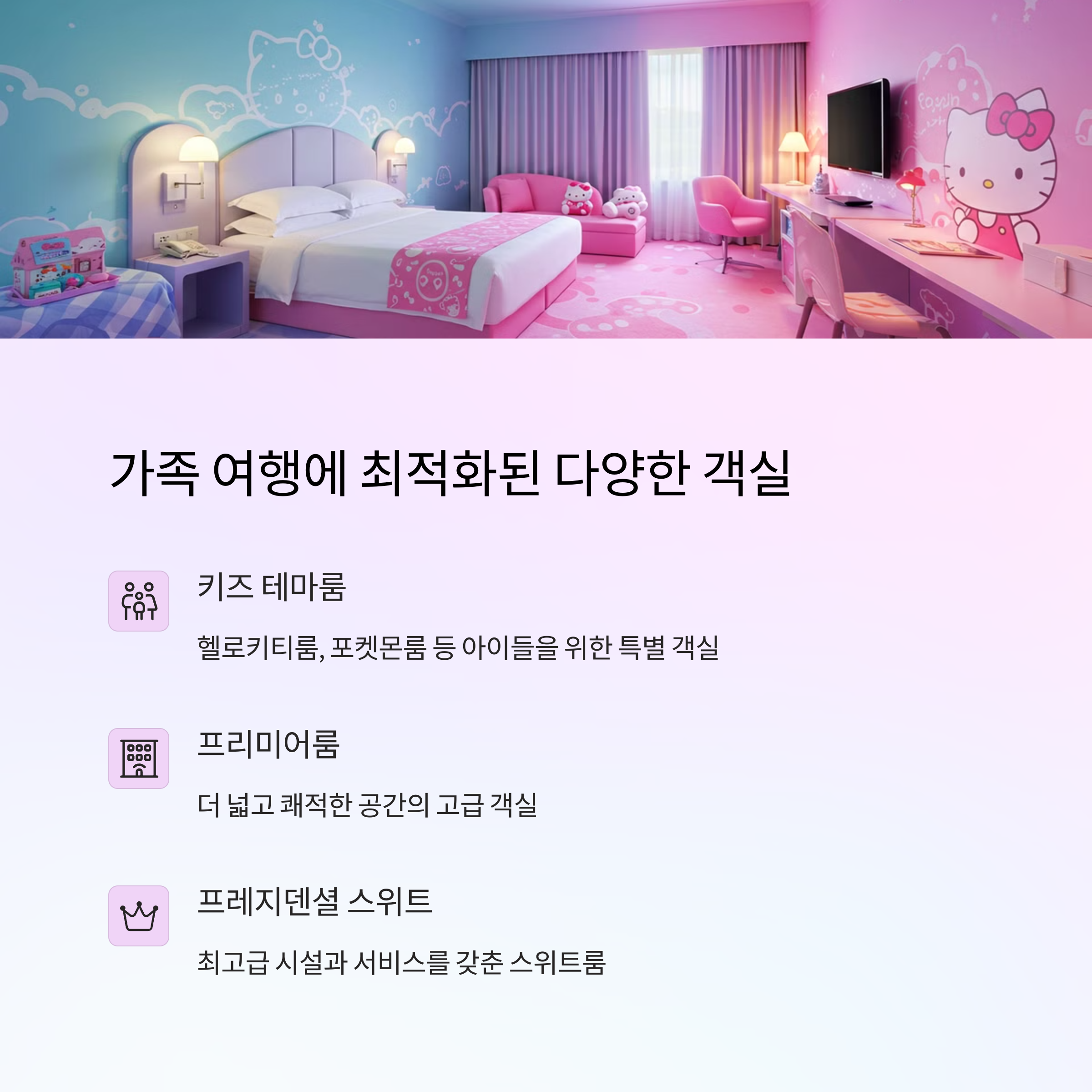 키즈룸부터 프레지덴셜 스위트까지, 다양한 룸타입