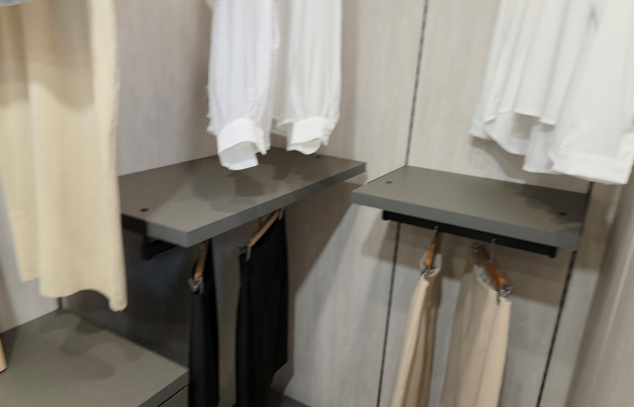 안방에는 발코니, 빨래건조대, 비상탈출구, 드레스룸 두 곳이 차례로 이어졌습니다. 드레스룸은 단순한 옷장이 아닌 전용 화장대, 선반, 수납공간, 전신 거울까지 갖춰진 '개인 스타일링 공간'이라는 느낌이었죠.