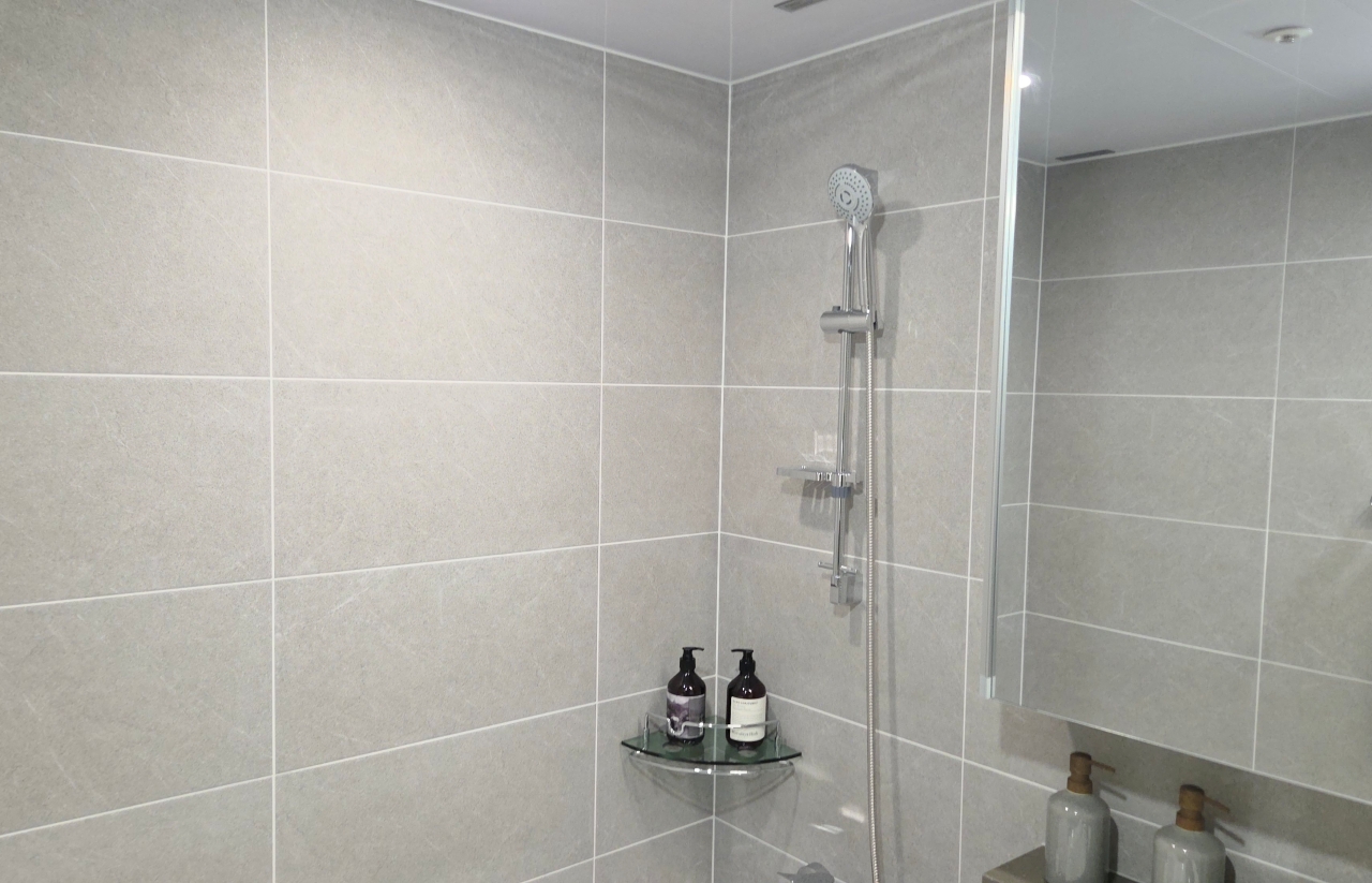 왼편엔 공용 욕실이 있었고요. 해색톤의 타일, 은은한 조명이 어우러진 그 공간은 단정하고 깔끔한, 말 그대로 편안한 욕실이었습니다.