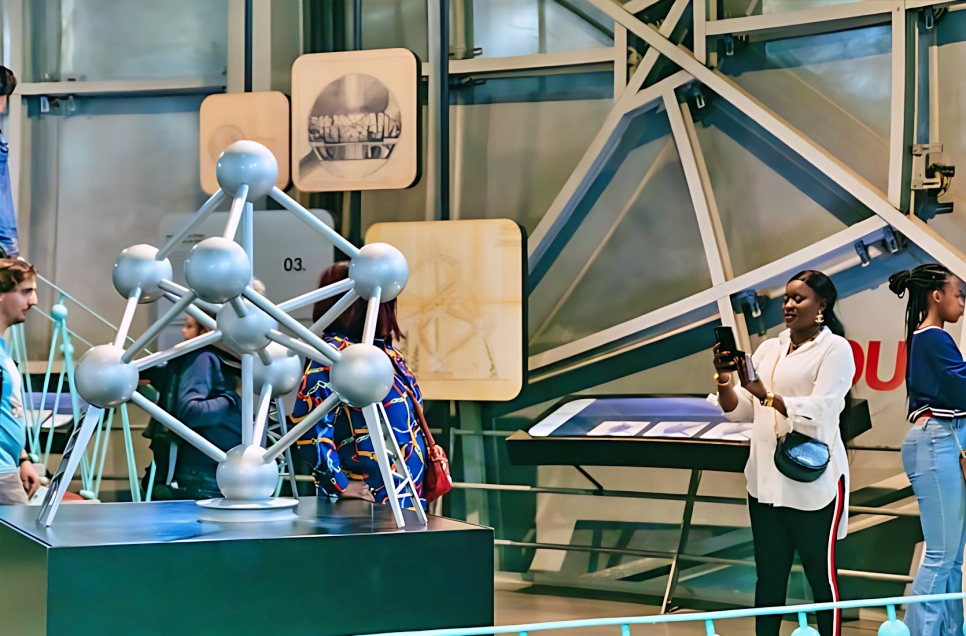 아토미움은 철의 결정 구조를 165억 배 확대하여 설계된 독창적인 구조로, 9개의 구형으로 이루어져 있습니다. 각각의 구는 과학, 예술, 디자인 전시관으로 활용되며, 최상층에서는 브뤼셀의 파노라마 뷰를 감상할 수 있습니다.