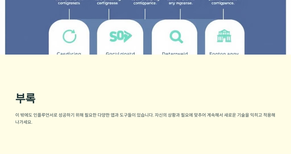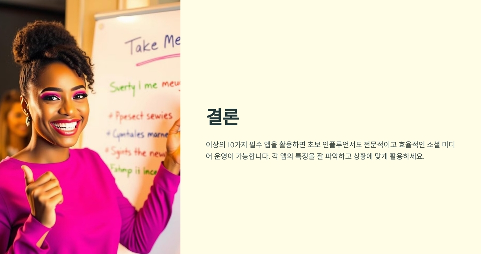 인플루언서 활동을 성공적으로 시작하기 위해서는 다양한 도구들이 필요합니다. 앞서 소개한 각 앱은 초보 인플루언서의 업무 효율성을 높이고, 질 높은 콘텐츠 제작과 관리를 지원합니다. 앞으로의 인플루언서 여정에서 지속적으로 업데이트된 툴과 팁을 제공할 것을 약속드리며, 여러분의 성공적인 활동을 응원합니다.