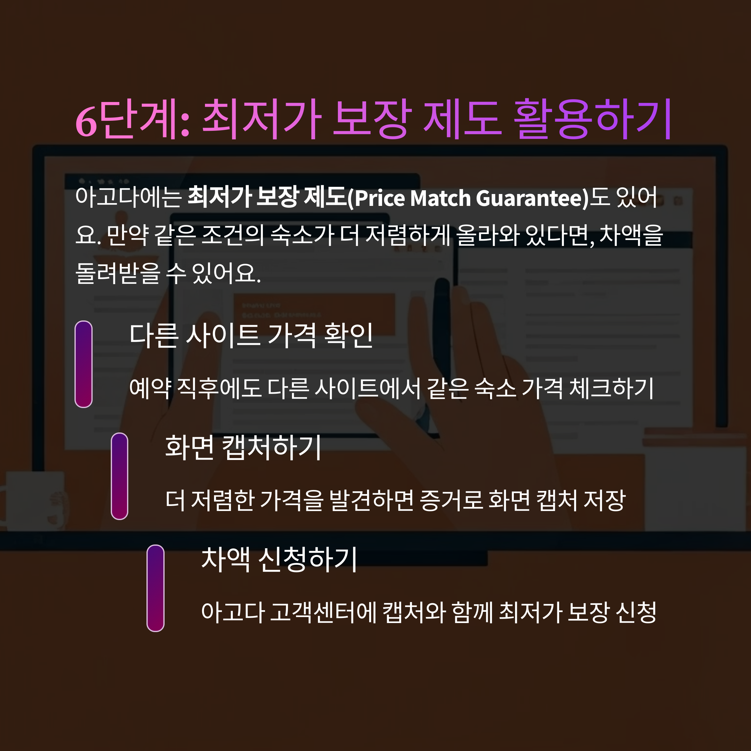 그리고 아고다에는 최저가 보장 제도(Price Match Guarantee)도 있어요. 만약 같은 조건의 숙소가 더 저렴하게 올라와 있다면, 차액을 돌려받을 수 있어요. 단, 캡처해서 신청해야 하니 예약 직후라도 다른 사이트를 다시 한번 체크해보는 걸 추천드립니다.