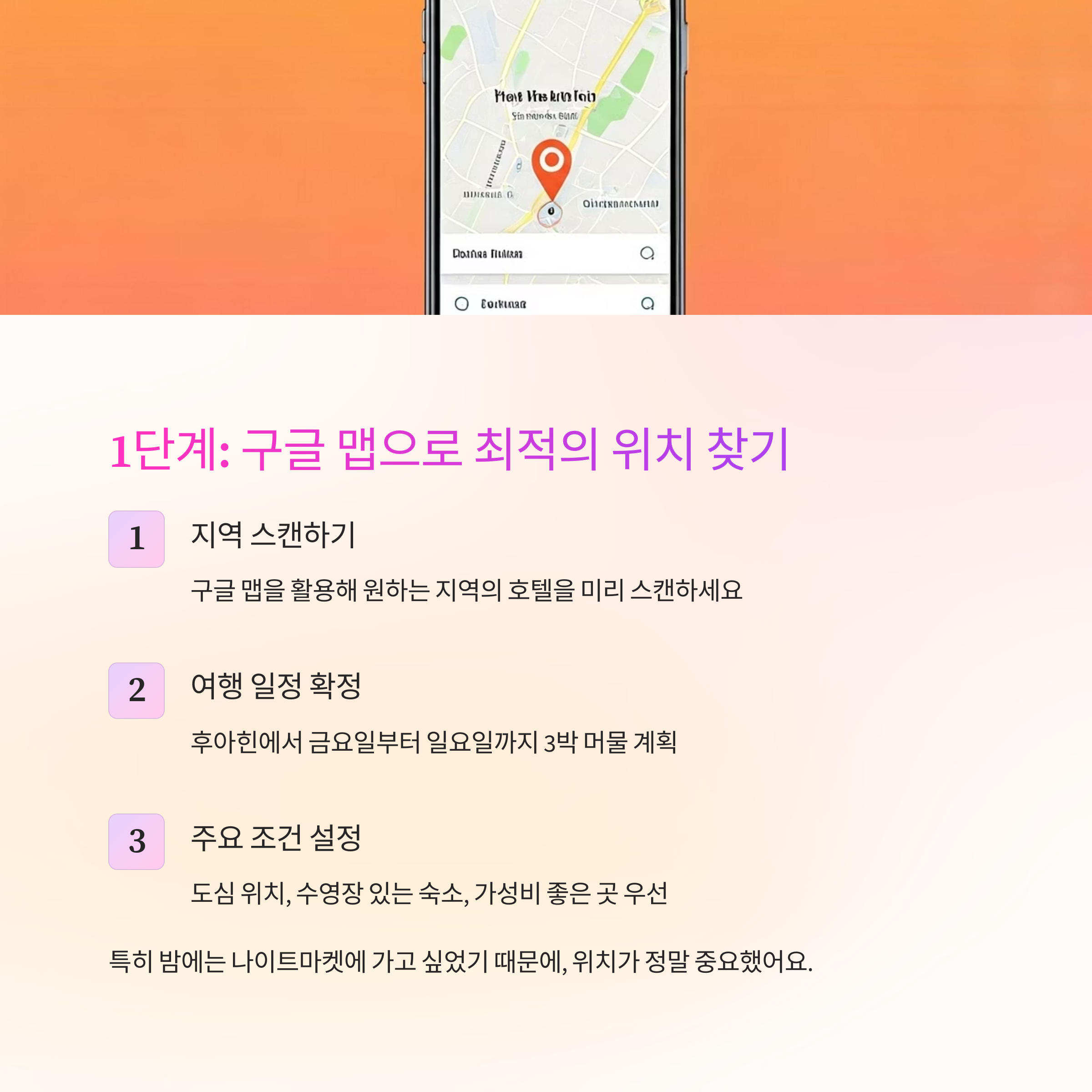 여행을 계획하면서 가장 먼저 한 일은 구글 맵을 활용해 원하는 지역의 호텔을 미리 스캔하는 것이었어요. 제가 찾던 지역은 태국의 후아힌이었고, 금요일부터 일요일까지 3박을 머무를 계획이었죠. 주요 조건은 도심에 위치한 곳, 수영장이 있는 숙소, 그리고 가성비가 좋은 곳이었어요. 특히 밤에는 나이트마켓에 가고 싶었기 때문에, 위치가 정말 중요했죠.