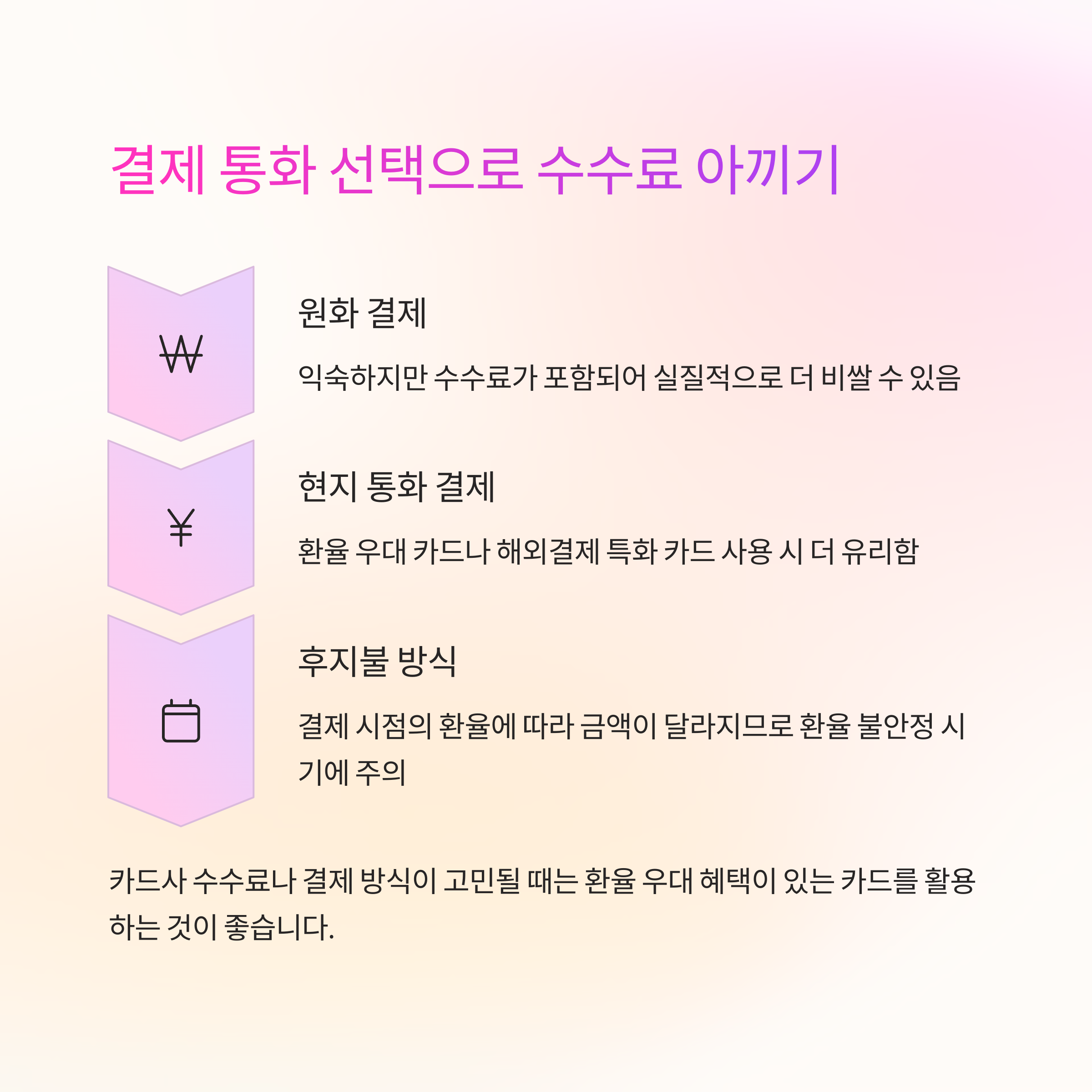 일반적으로는 환율 우대를 받는 카드나 수수료가 없는 해외결제 특화 카드를 사용해 현지 통화로 결제하는 게 유리한 경우가 많습니다. 반대로 원화 결제를 선택하면 익숙하긴 하지만 수수료가 포함돼 실질적으로 더 비쌀 수 있어요. 특히 후지불(나중 결제) 방식은 결제 시점의 환율에 따라 금액이 달라지기 때문에, 환율이 불안정한 시기엔 조심해야 합니다.