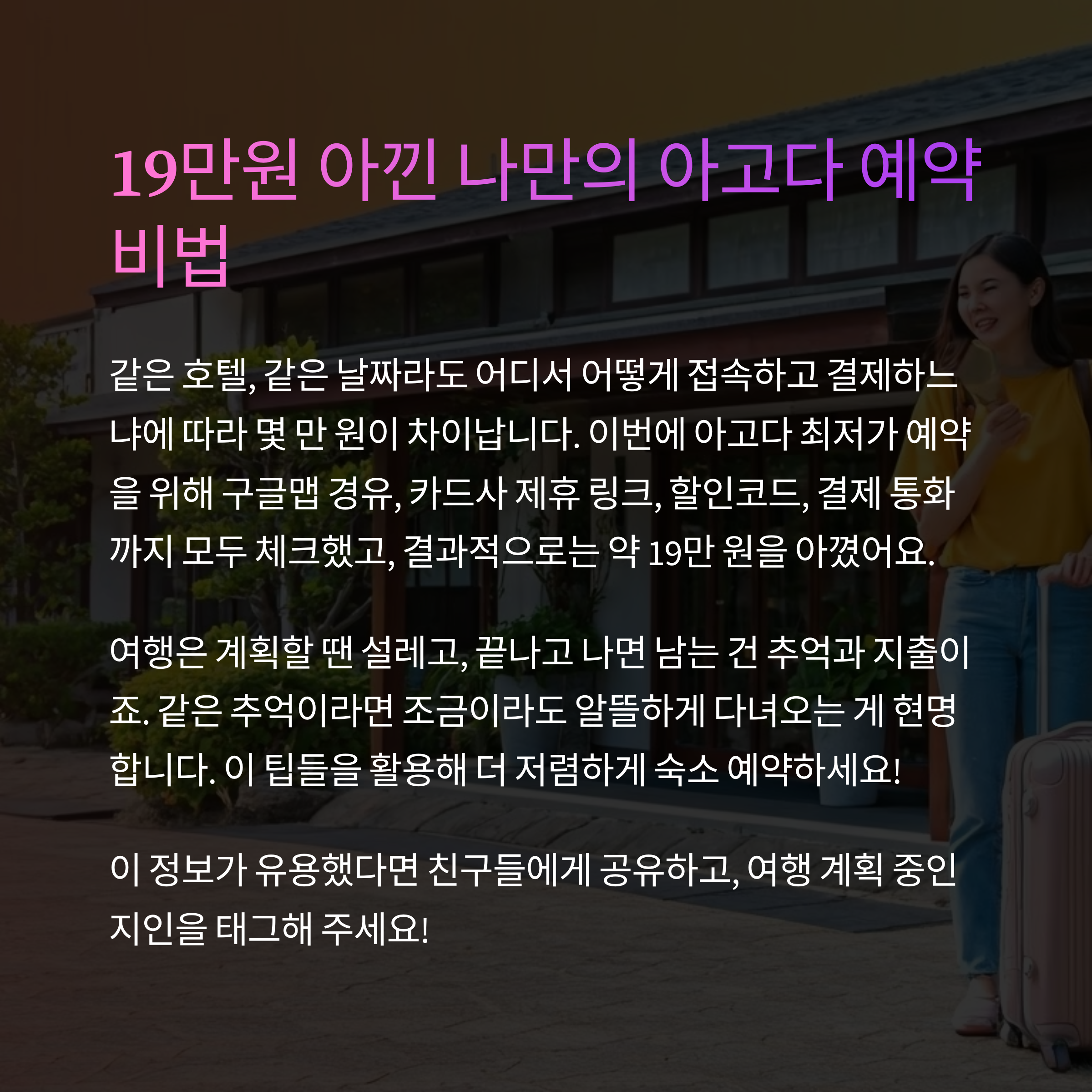 여행이란 건 계획할 땐 설레고, 끝나고 나면 남는 건 추억과 지출이잖아요. 같은 추억이라면 조금이라도 알뜰하게 다녀오는 게 현명하다고 생각해요. 여러분도 이 팁들 잘 기억해서, 더 저렴하게 숙소 예약하시길 바랍니다!