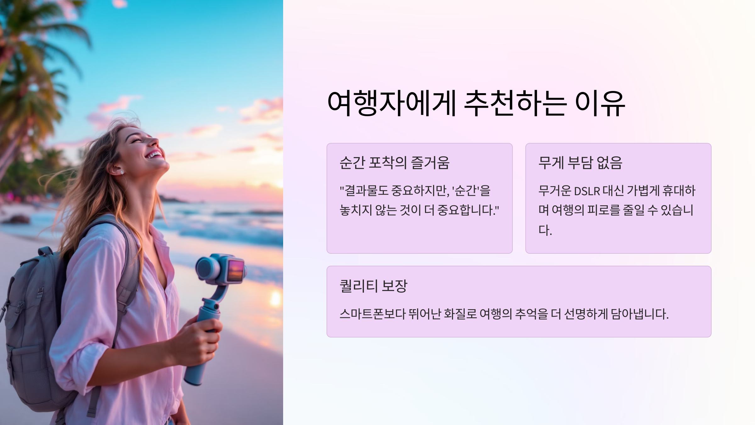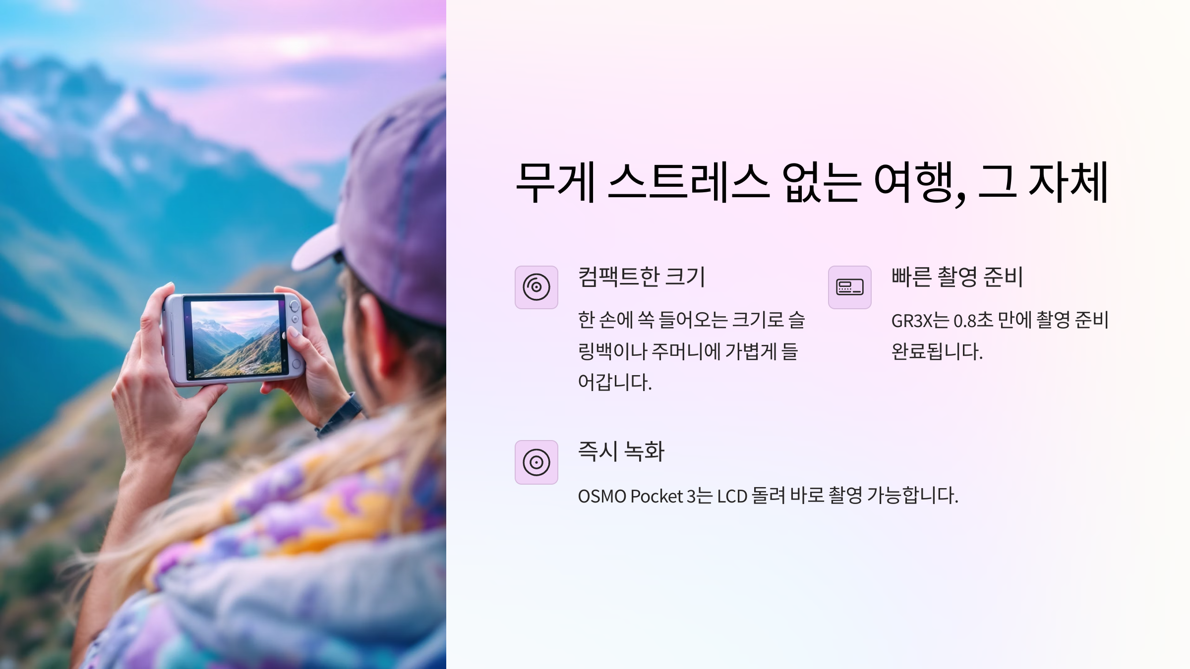 그런데 무거운 카메라 장비 하나 때문에 그 추억이 ‘피로’로 바뀌는 건 너무 아쉬운 일이에요.