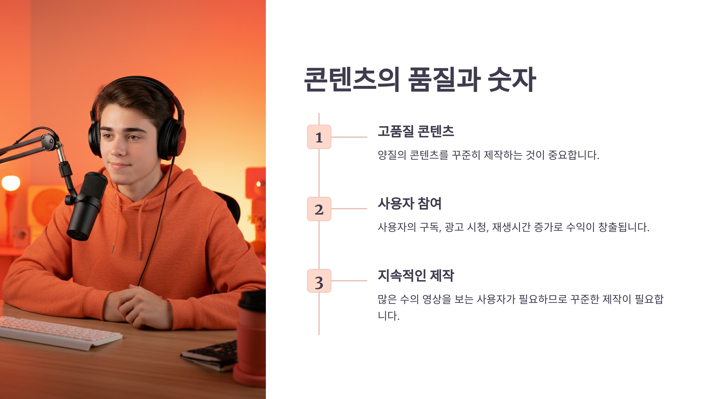 유튜브의 수익 생성은 많은 수의 영상을 보는 사용자가 필요하므로 고품질의 콘텐츠를 꾸준히 제작하는 것이 중요합니다. 양질의 콘텐츠를 많이 제작하면 사용자는 구독하거나, 광고를 시청하거나, 재생시간을 늘리는 방법으로 수익을 창출할 수 있습니다.