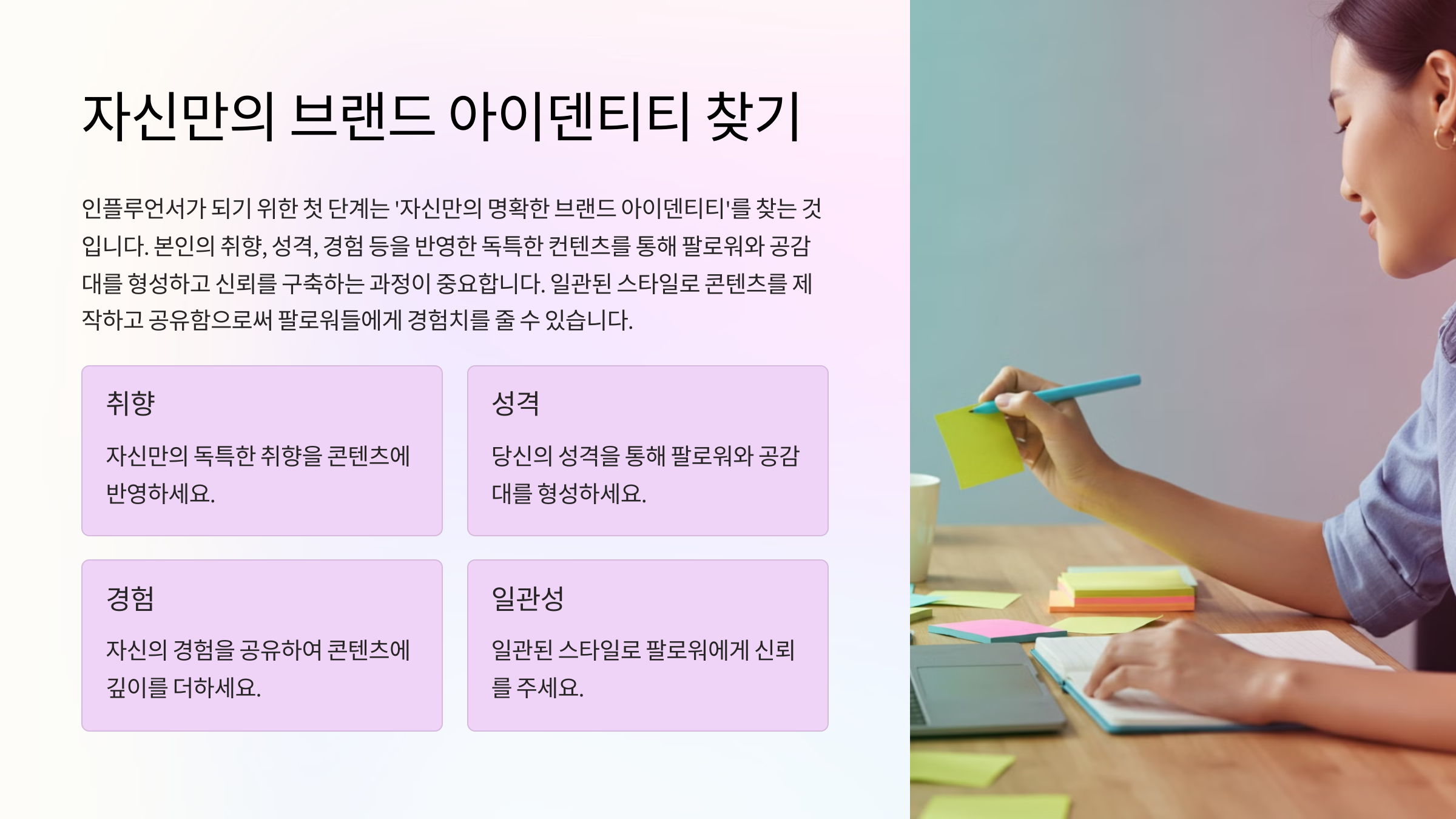 먼저, 인플루언서가 되기 위한 활동을 살펴보자면 가장 중요한 것은 '자신만의 명확한 브랜드 아이덴티티'를 찾는 것입니다. 본인의 취향, 성격, 경험 등을 반영한 독특한 컨텐츠를 통해 팔로워와 공감대를 형성하여 신뢰를 구축하는 과정이 중요합니다. 또한 일관된 스타일로 콘텐츠를 제작하고 공유함으로써 팔로워들에게 경험치를 줄 수 있습니다.