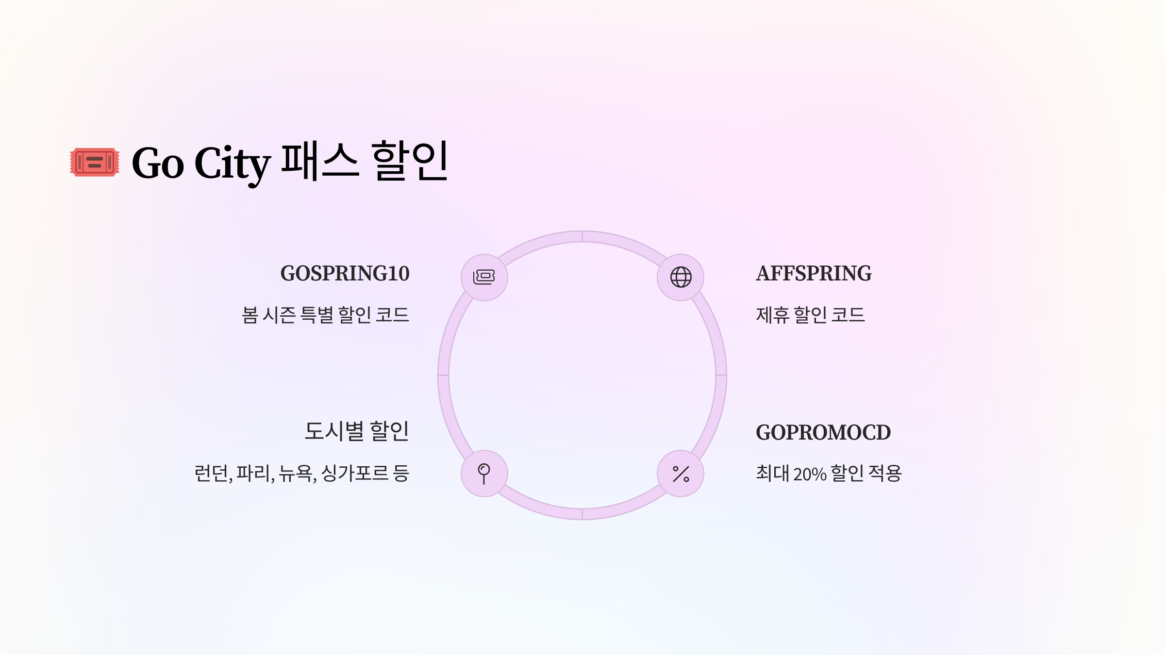 - GOSPRING10 / AFFSPRING / GOPROMOCD – 최대 20% 할인 적용 / 도시별 (예: 런던, 파리, 뉴욕, 싱가포르 등)