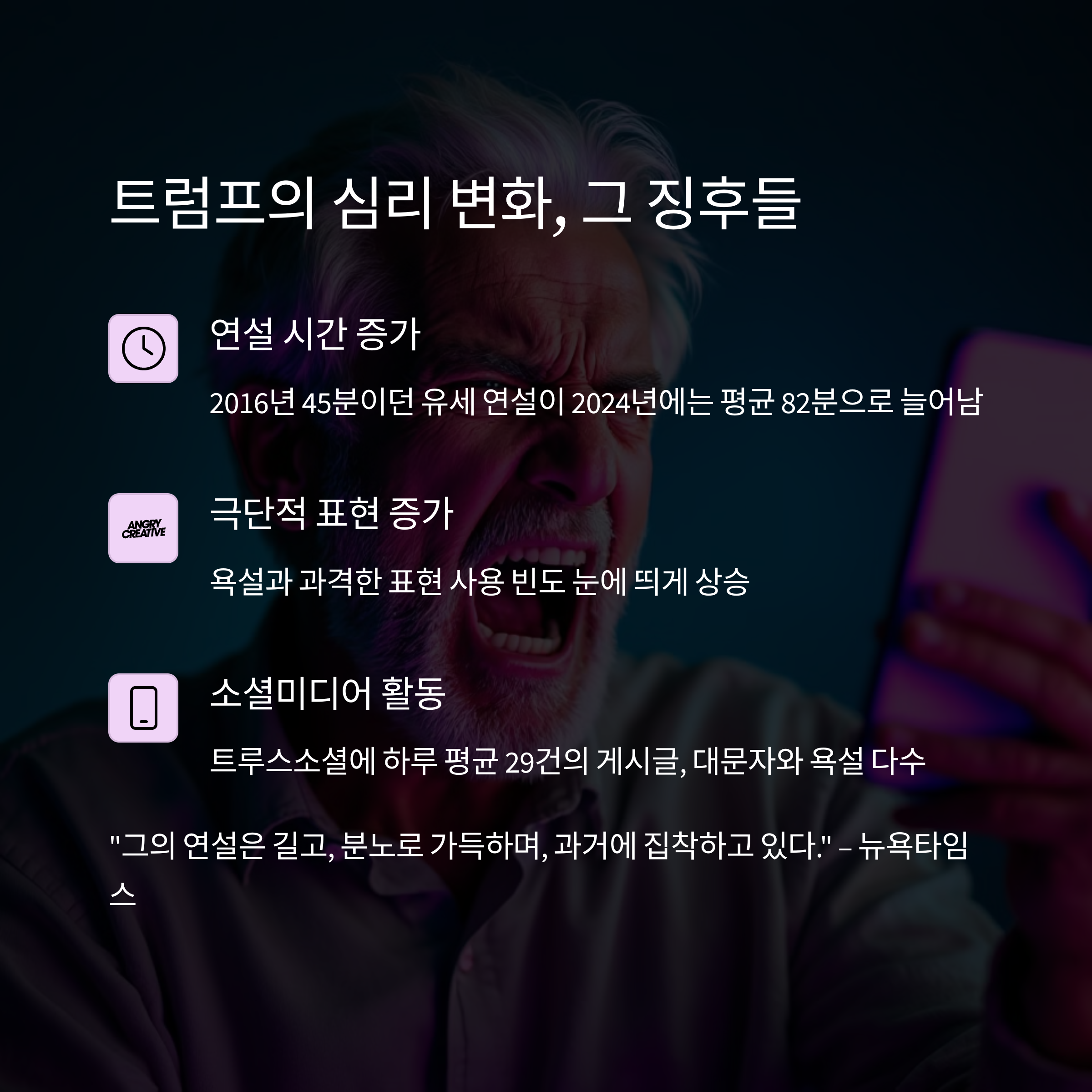 최근 트럼프의 발언을 보면 예전보다 더 공격적이고, 감정적이며, 장황합니다.