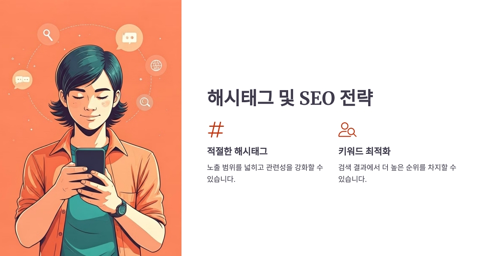 소셜 미디어에서 효과적인 해시태그 사용은 노출 범위를 넓히고 관련 주제를 효과적으로 연결합니다. 적절한 해시태그를 사용하면 게시물이 더 많은 시청자에게 도달할 수 있습니다. 또한, 키워드 최적화를 통해 검색 최적화(SEO)를 강화할 수 있습니다. 인기 있는 키워드를 사용하여 게시물의 가시성을 높이고, 더 많은 시청자를 유입시킬 수 있는 방법을 모색해야 합니다.