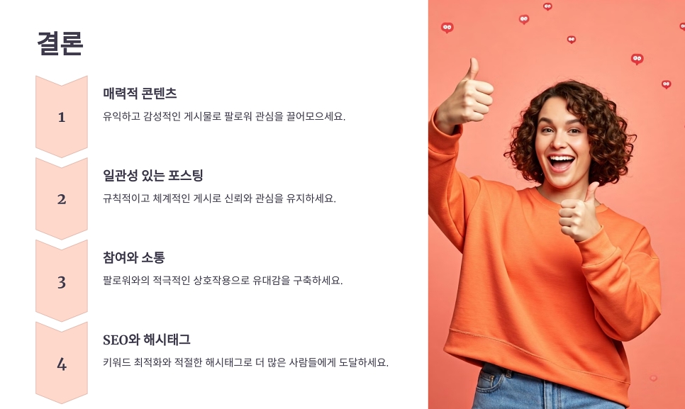 지금까지 소개한 다섯 가지 전략은 각각 소셜 미디어에서 팔로워 증가에 기여할 다양한 방법을 제공합니다. 매력적인 콘텐츠 제작, 일관성 있는 포스팅, 참여 유도와 커뮤니케이션, 해시태그 및 SEO 전략, 그리고 협업과 네트워킹은 모두 팔로워를 늘리는 데 효과적인 전략입니다. 이 전략들을 실제로 실행하여 소셜 미디어 성장을 적극적으로 도모해 보세요. 이러한 전략이 여러분의 소셜 미디어 플랫폼에서 성공적인 성장을 지원할 것입니다." #소셜미디어 #팔로워늘리기 #콘텐츠제작 #스토리텔링 #일관성있는포스팅 #콘텐츠캘린더 #참여유도 #커뮤니케이션 #해시태그전략 #SEO #인플루언서협업 #네트워킹 #소셜미디어전략 #성장전략 #브랜드홍보 #커뮤니티관리 #실행계획 #성공적인성장