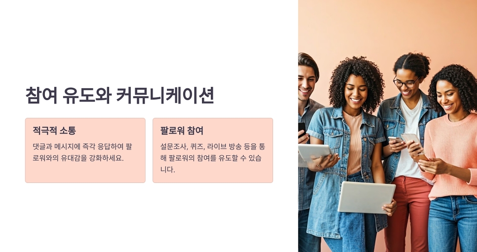 소셜 미디어에서는 단방향 소통이 아닌 쌍방향 소통이 필요합니다. 따라서 댓글과 메시지에 대한 응대, 커뮤니티 관리는 필수적입니다. 적극적인 소통은 팔로워와의 관계를 더욱 견고하게 만듭니다. 팔로워가 당신의 게시물에 반응할 때, 그들에게 응답하고 소통하여 참여를 촉진해야 합니다. 설문조사, 퀴즈, 라이브 방송과 같은 인터랙티브 요소를 통해 팔로워가 더 많이 참여할 수 있도록 유도할 수 있습니다.