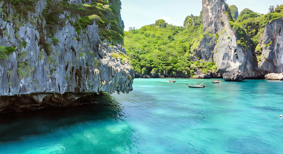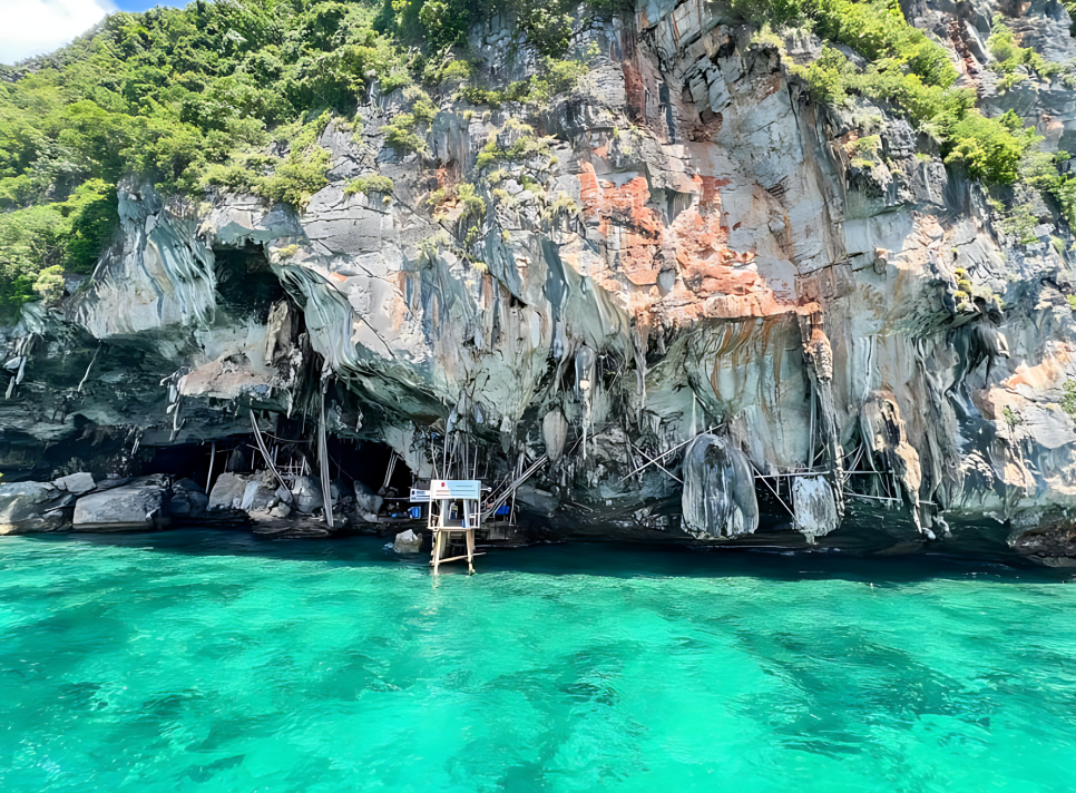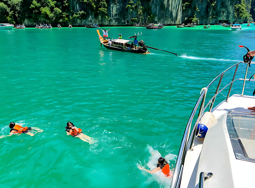 이른 아침 호텔에서 픽업되어 스피드보트에 올라탄 순간, 바다를 가르며 앞으로 나아가는 속도감과 함께 시원한 바람이 얼굴을 스쳤습니다. 첫 번째 목적지는 마야 베이. 영화 더 비치의 촬영지로 유명한 이곳은 상상 이상으로 아름다웠습니다. 눈부시게 하얀 모래사장과 맑고 잔잔한 바다는 마치 엽서 속에서 튀어나온 듯했죠.