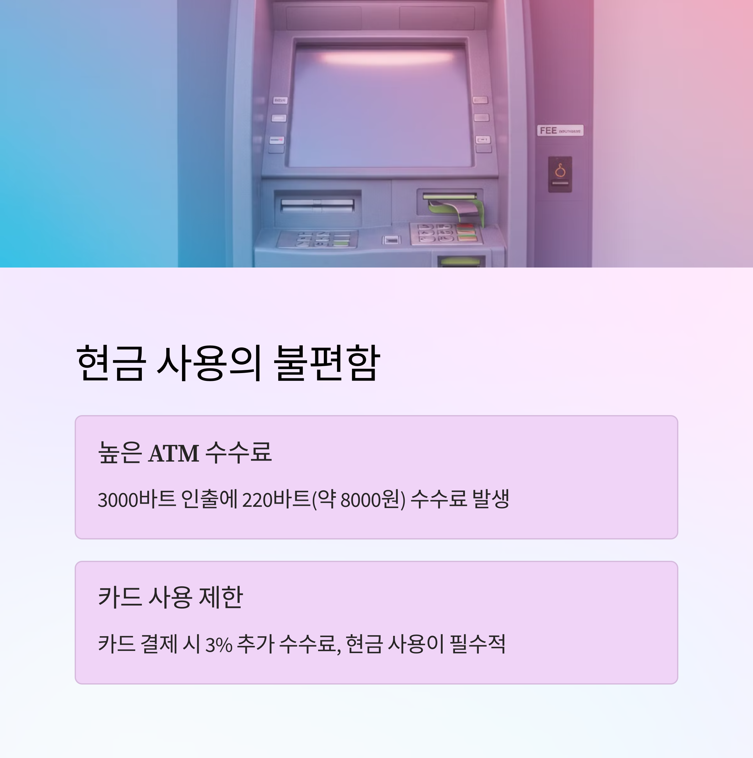 여행하면서 카드 사용이 쉽지 않았습니다. 공항 ATM에서 3000바트(약 11만 원)를 인출했는데, 수수료가 220바트(약 8000원)나 붙었어요. 게다가 깜빡하고 카드를 기계에 두고 나오는 바람에 급하게 정지시키는 사태까지 벌어졌습니다. 푸켓에서는 카드 결제가 안 되는 곳도 많고, 가능하더라도 3% 추가 수수료를 내야 해서 결국 현금을 계속 인출해야 했어요.