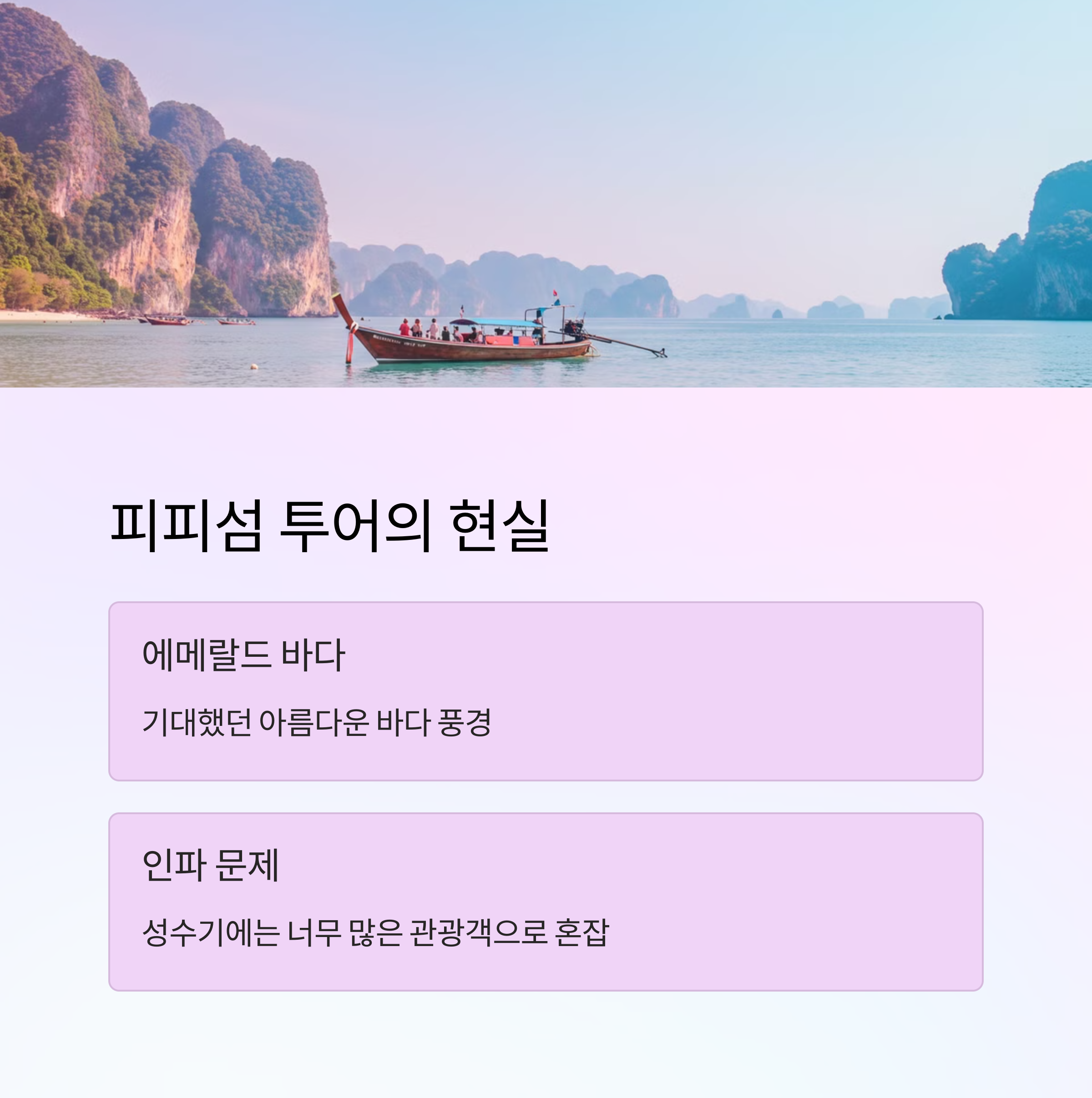 푸켓에 왔다면 피피섬 투어는 필수죠. 드디어 출발! 기대했던 에메랄드빛 바다를 보러 갔지만, 성수기의 단점이 확실하게 드러났어요. 사람이 너무 많았습니다. 배를 타고 이동하는 동안 멀미로 힘들어하는 여행객들도 있었고, 카이섬에 도착하자마자 떠밀리듯 관광이 시작되더군요.