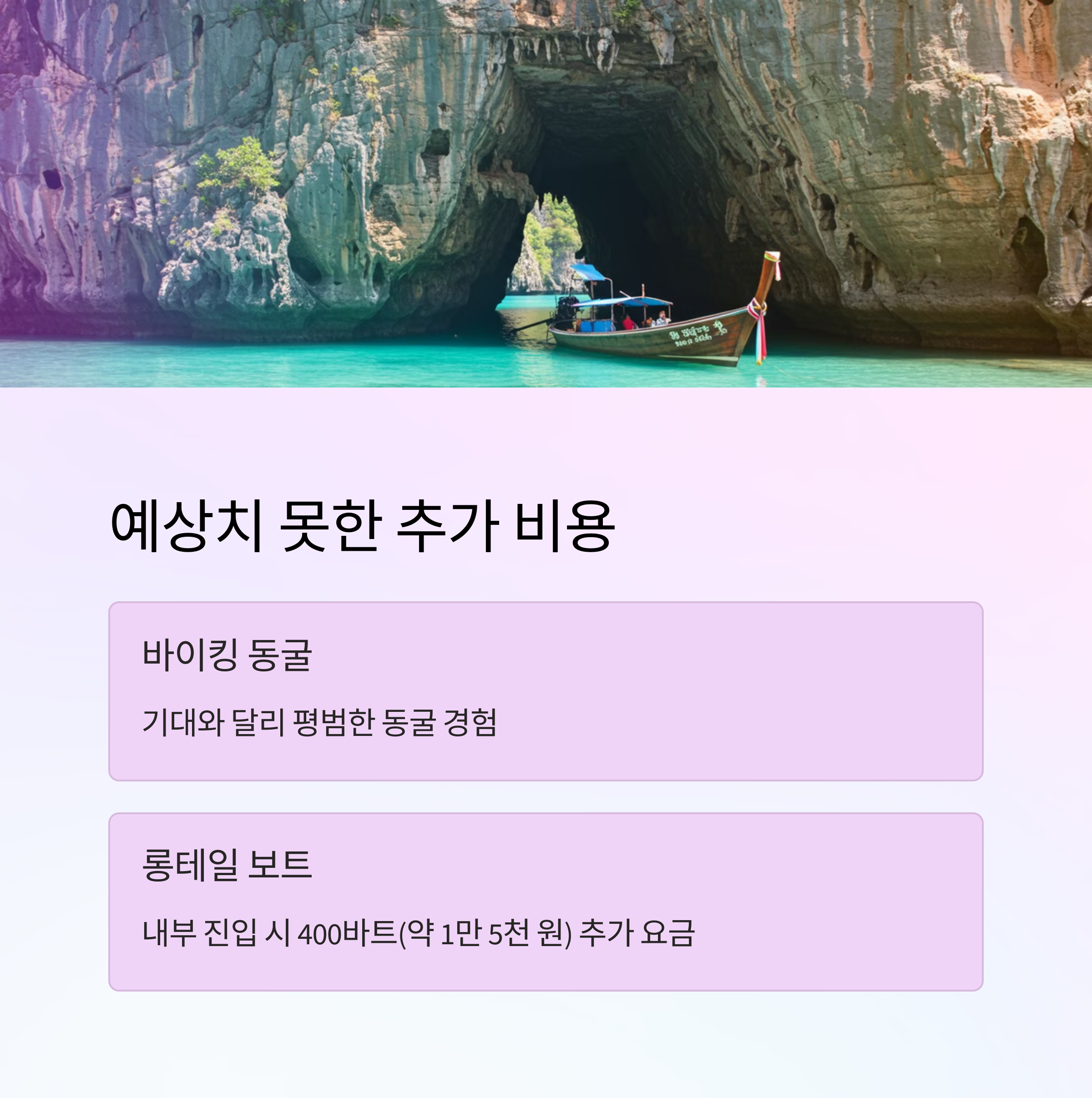 바이킹 동굴은 기대했던 것과 달리 '그냥 동굴'이었습니다. 그리고 롱테일 보트를 타고 안쪽으로 들어가려면 400바트(약 1만 5천 원)를 추가로 내야 했는데, 이건 좀 심하다는 생각이 들었어요. 성수기라서 그런지 관광객 대상 추가 요금이 많았습니다.