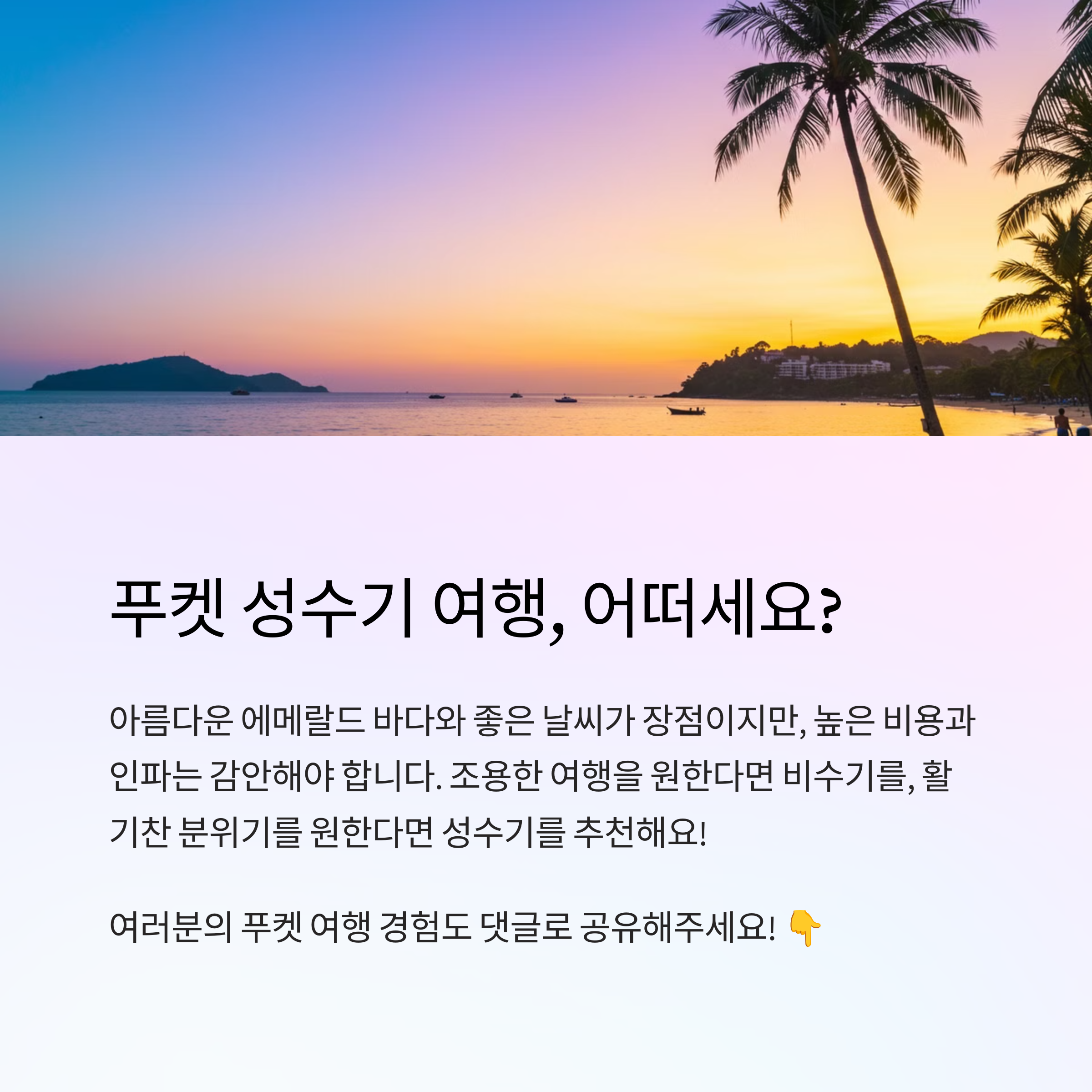 만약 조용하고 한적한 푸켓을 원하신다면, 성수기보다는 비수기를 노리는 것이 더 좋을 것 같습니다. 하지만 '핫한' 분위기를 즐기고 싶다면, 성수기 푸켓도 나쁘지 않겠죠! 여러분은 어떤 여행을 원하시나요? 😃