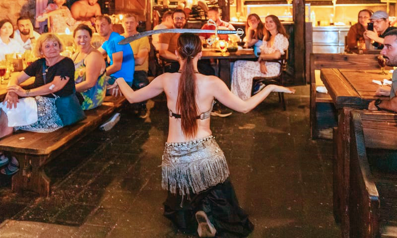 식사 중에는 중세를 테마로 한 공연이 이어집니다. 불 쇼, 검술 퍼포먼스, 그리고 우아한 춤 공연이 끊임없이 펼쳐져 지루할 틈이 없었어요. 공연자들이 손님들과 적극적으로 소통하며 분위기를 이끌어가는 모습이 특히 인상 깊었습니다. 마지막에는 모두 함께 박수치며 즐기는 화합의 시간도 마련되었답니다.