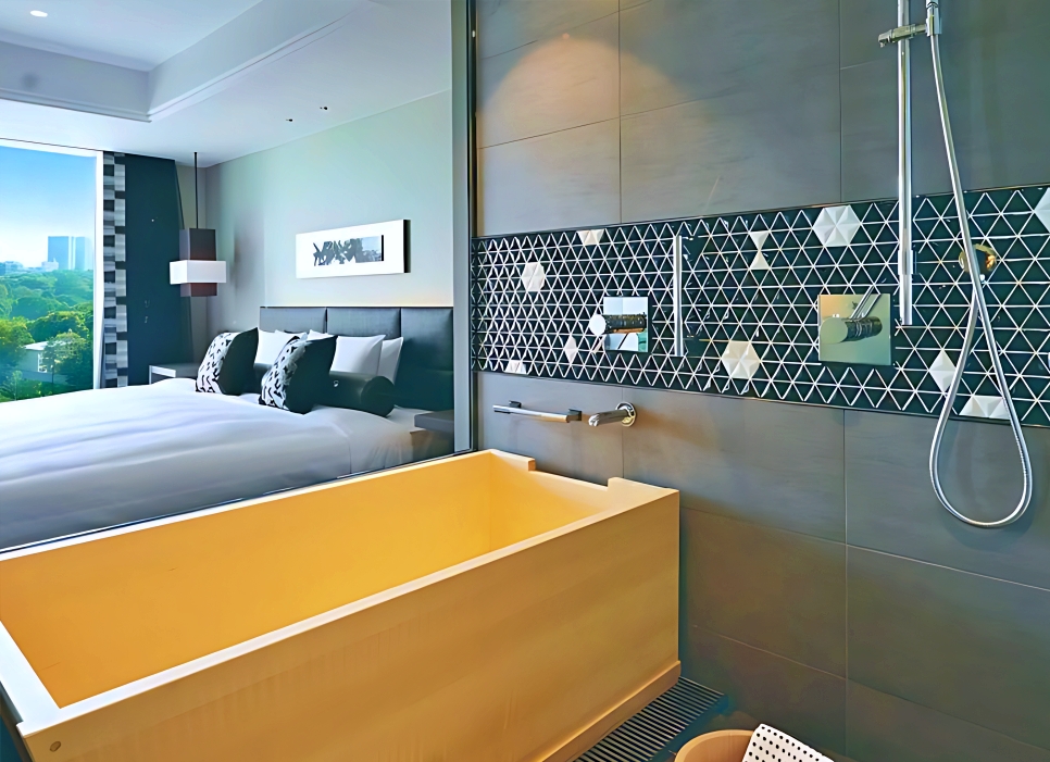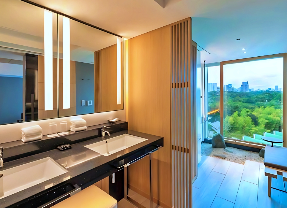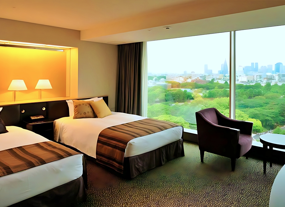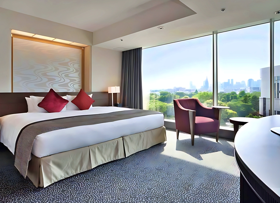 호텔 뉴 오타니 도쿄 더 메인의 객실은 넓고 세련된 디자인을 자랑하며, 특히 일본식 정원 또는 신주쿠 신도심의 전망을 감상할 수 있는 큰 창문이 특징입니다.