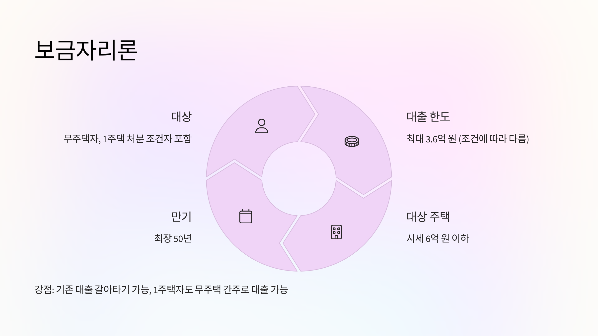 | 상품명 | 주 대상 | 대출 용도 | 금리 | 대출 한도 | 실거주 요건 | 대환 가능 여부 |