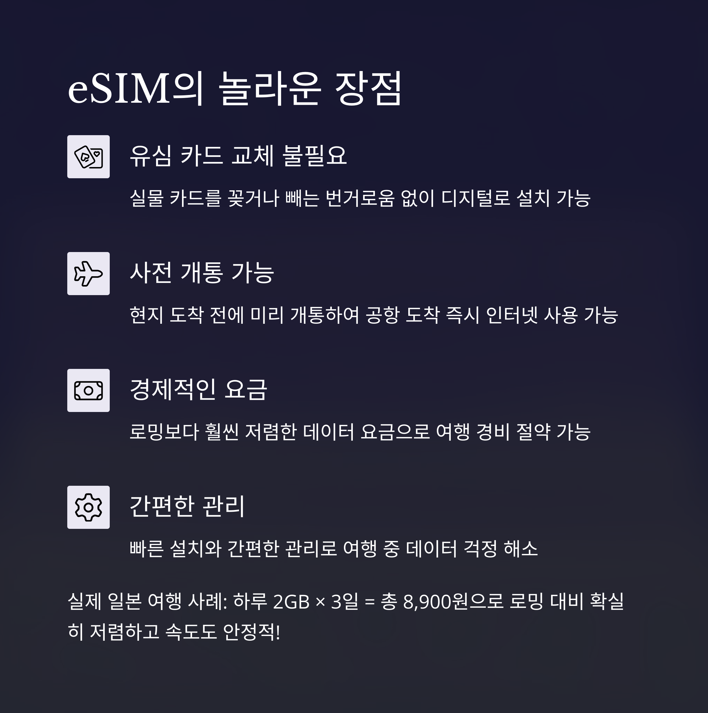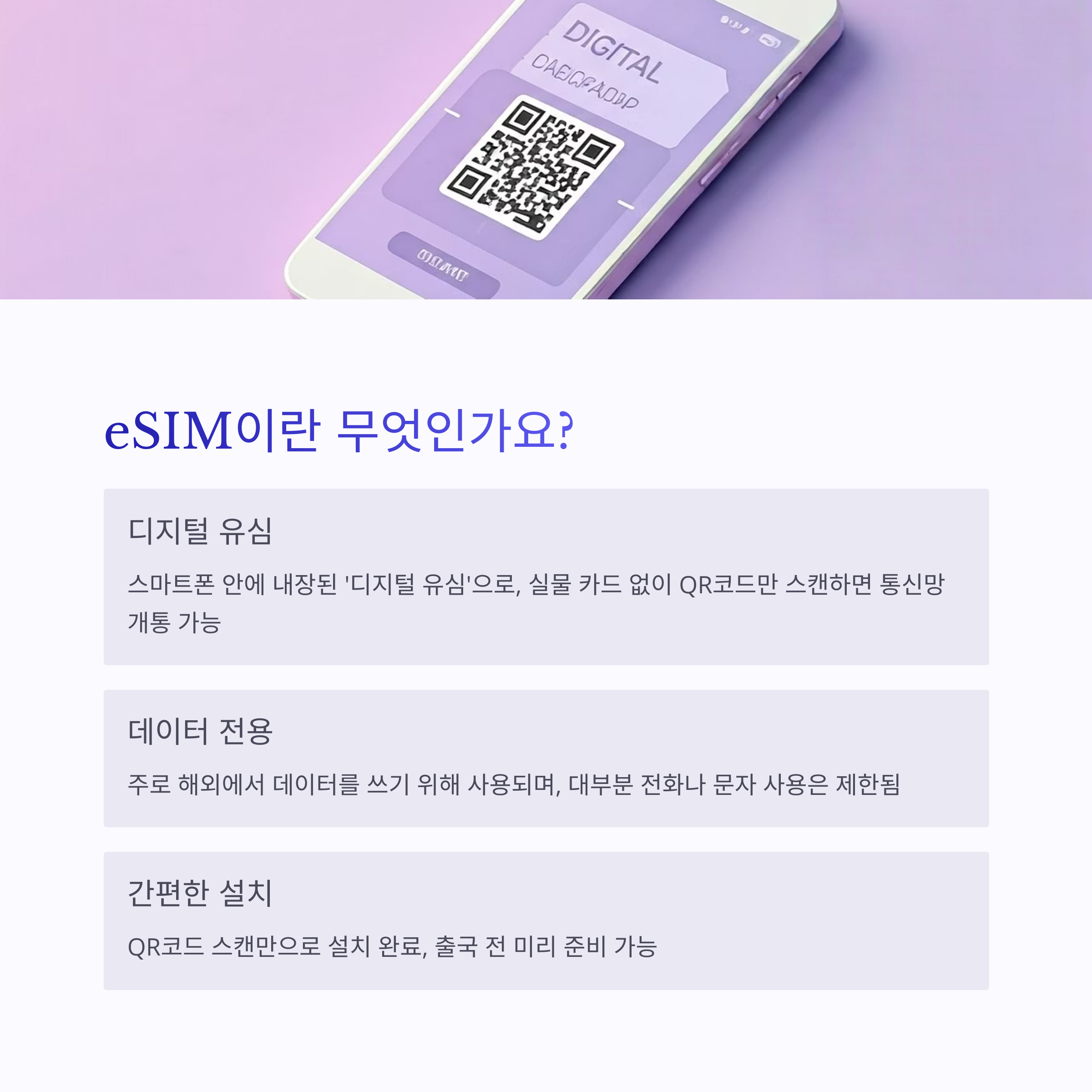 기존의 USIM처럼 실물 카드를 넣지 않아도, QR코드만 스캔하면 통신망을 개통하고 데이터 사용이 가능하죠. 주로 해외에서 데이터를 쓰기 위해 많이 사용되고, 전화나 문자 사용은 제한되는 경우가 많습니다.