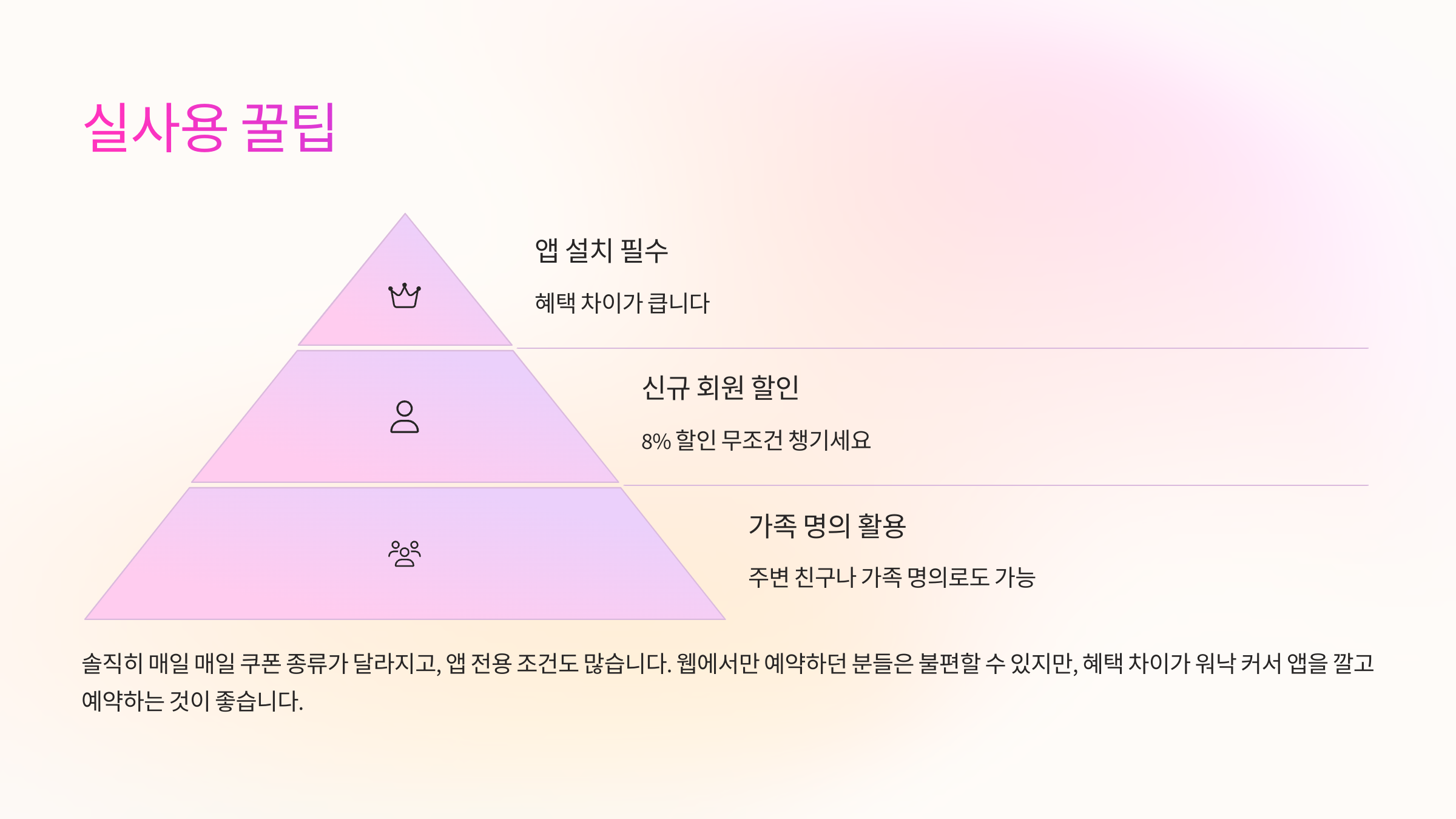 저처럼 웹에서만 예약하던 분들은 조금 불편하게 느껴질 수도 있는데, 혜택 차이가 워낙 커서 저도 결국 앱을 깔고 예약하게 되더라고요.