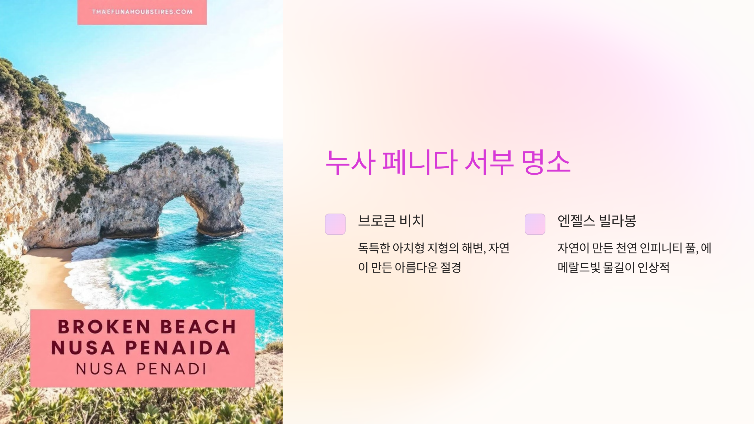 발리에서 멀지 않은 **누사 페니다(Nusa Penida)**는 눈을 뗄 수 없는 자연의 아름다움을 간직한 섬입니다. 이번 여행에서는 누사 페니다의 동부와 서부를 하루 만에 둘러볼 수 있는 알찬 투어에 참여했는데요, 꿈 같은 풍경과 잊지 못할 순간들이 가득했던 하루를 소개합니다.