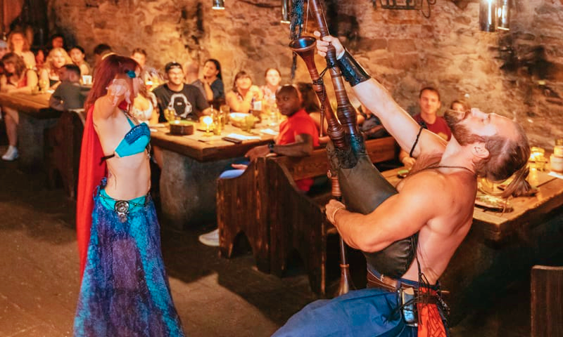 식사 중에는 중세를 테마로 한 공연이 이어집니다. 불 쇼, 검술 퍼포먼스, 그리고 우아한 춤 공연이 끊임없이 펼쳐져 지루할 틈이 없었어요. 공연자들이 손님들과 적극적으로 소통하며 분위기를 이끌어가는 모습이 특히 인상 깊었습니다. 마지막에는 모두 함께 박수치며 즐기는 화합의 시간도 마련되었답니다.