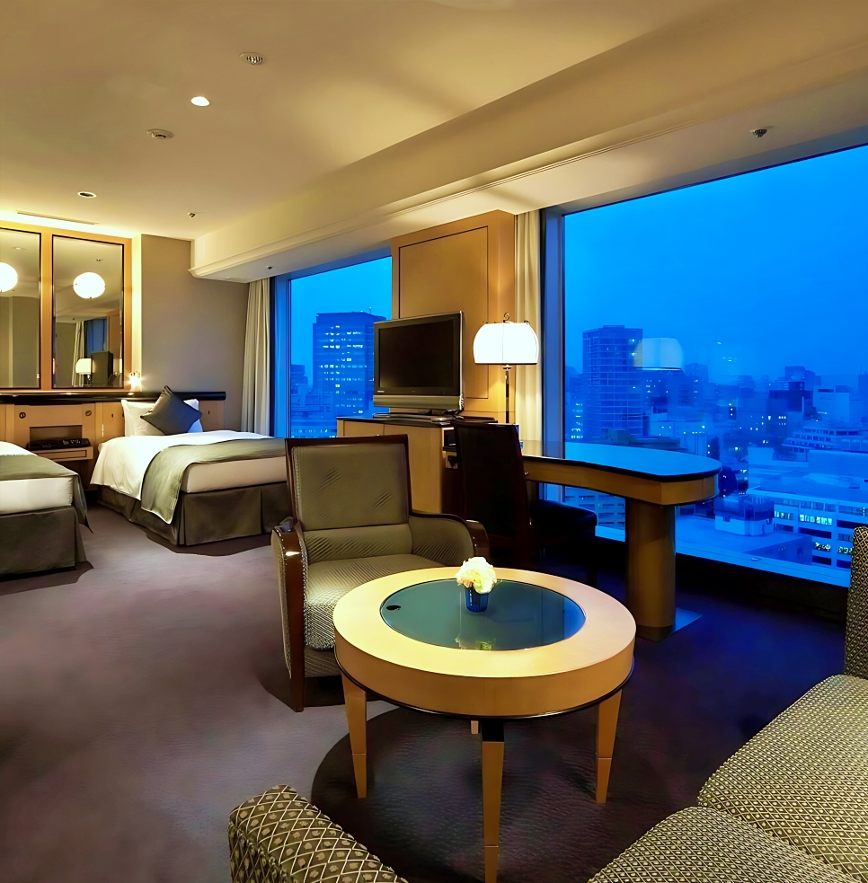 호텔 뉴 오타니 도쿄 더 메인의 객실은 넓고 세련된 디자인을 자랑하며, 특히 일본식 정원 또는 신주쿠 신도심의 전망을 감상할 수 있는 큰 창문이 특징입니다.