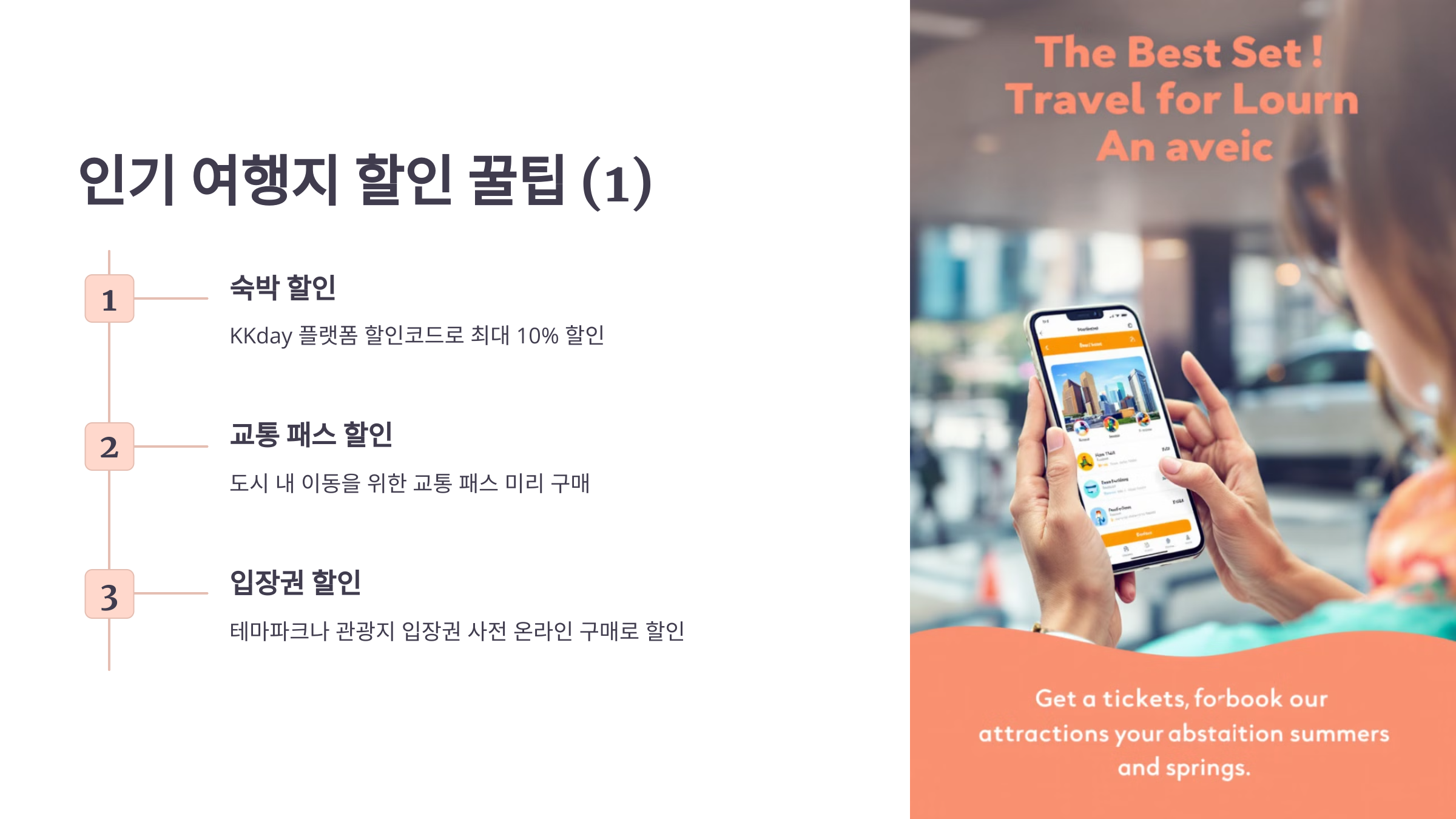 숙박 할인: 여행지의 숙박 시설을 예약할 때, KKday와 같은 플랫폼에서 제공하는 할인코드를 활용하면 최대 10%까지 할인받을 수 있습니다.