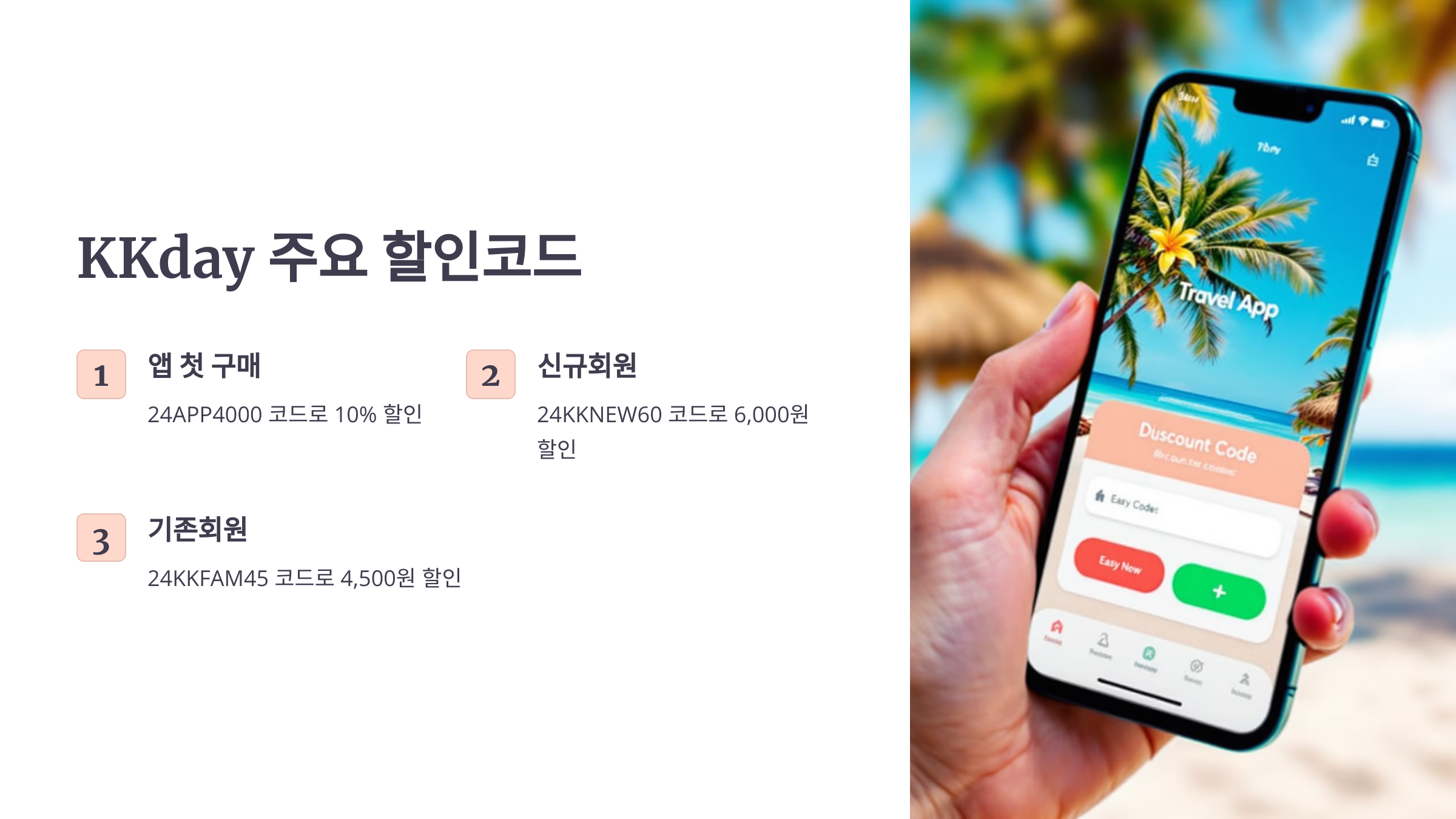 안녕하세요, 여행을 계획 중이신가요? 😊 다양한 할인 혜택을 활용하면 더욱 알뜰하게 여행을 즐길 수 있습니다. 특히 KKday에서 제공하는 할인코드를 잘 활용하면 다양한 여행 상품을 저렴하게 이용할 수 있는데요, 함께 알아볼까요?
