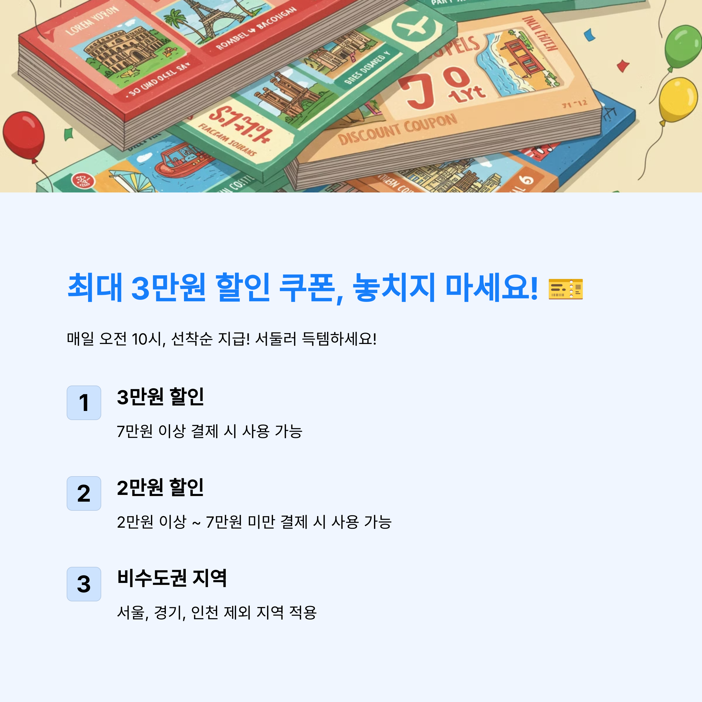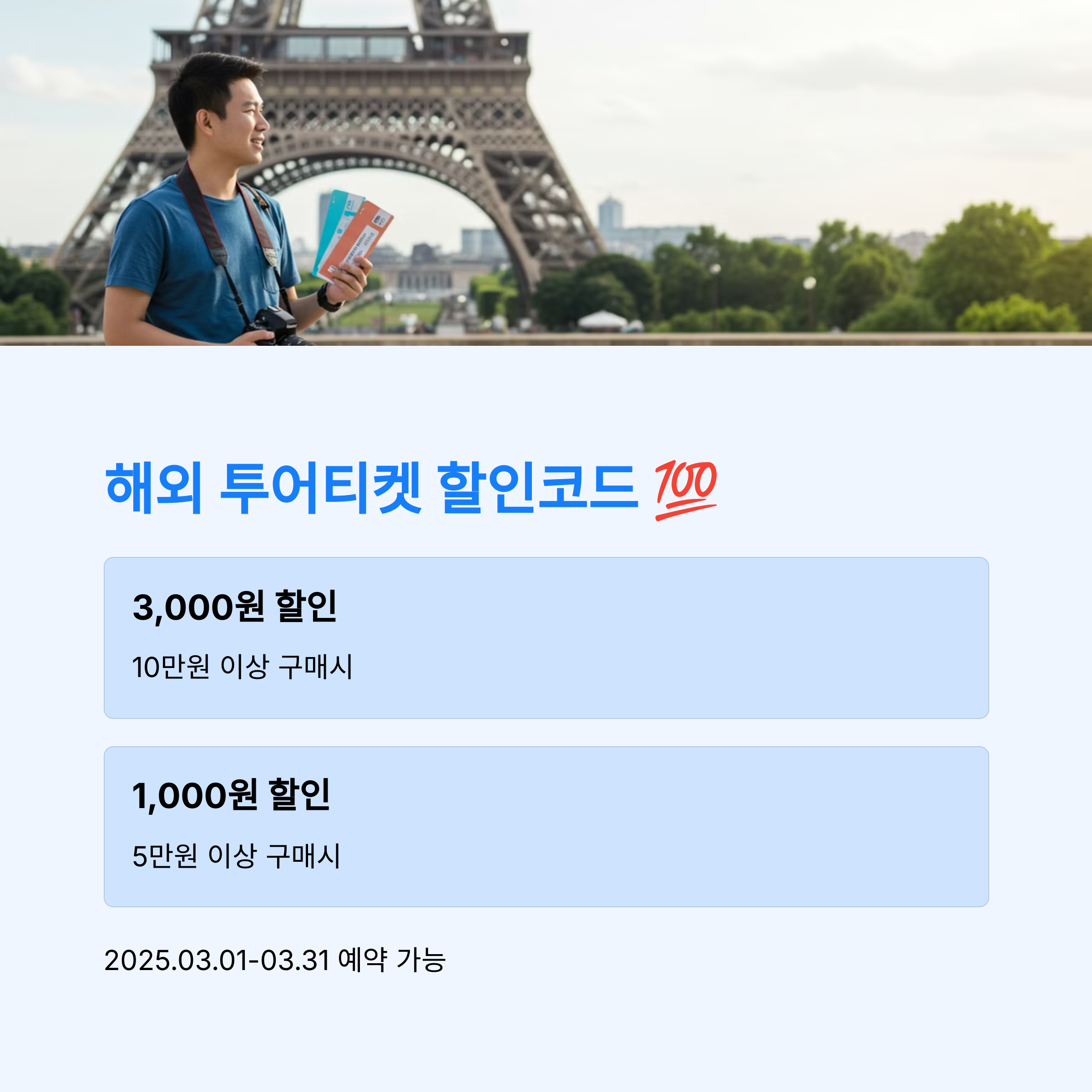✅ 3,000원 할인: 해외 투어티켓 10만 원 이상 구매 시 적용