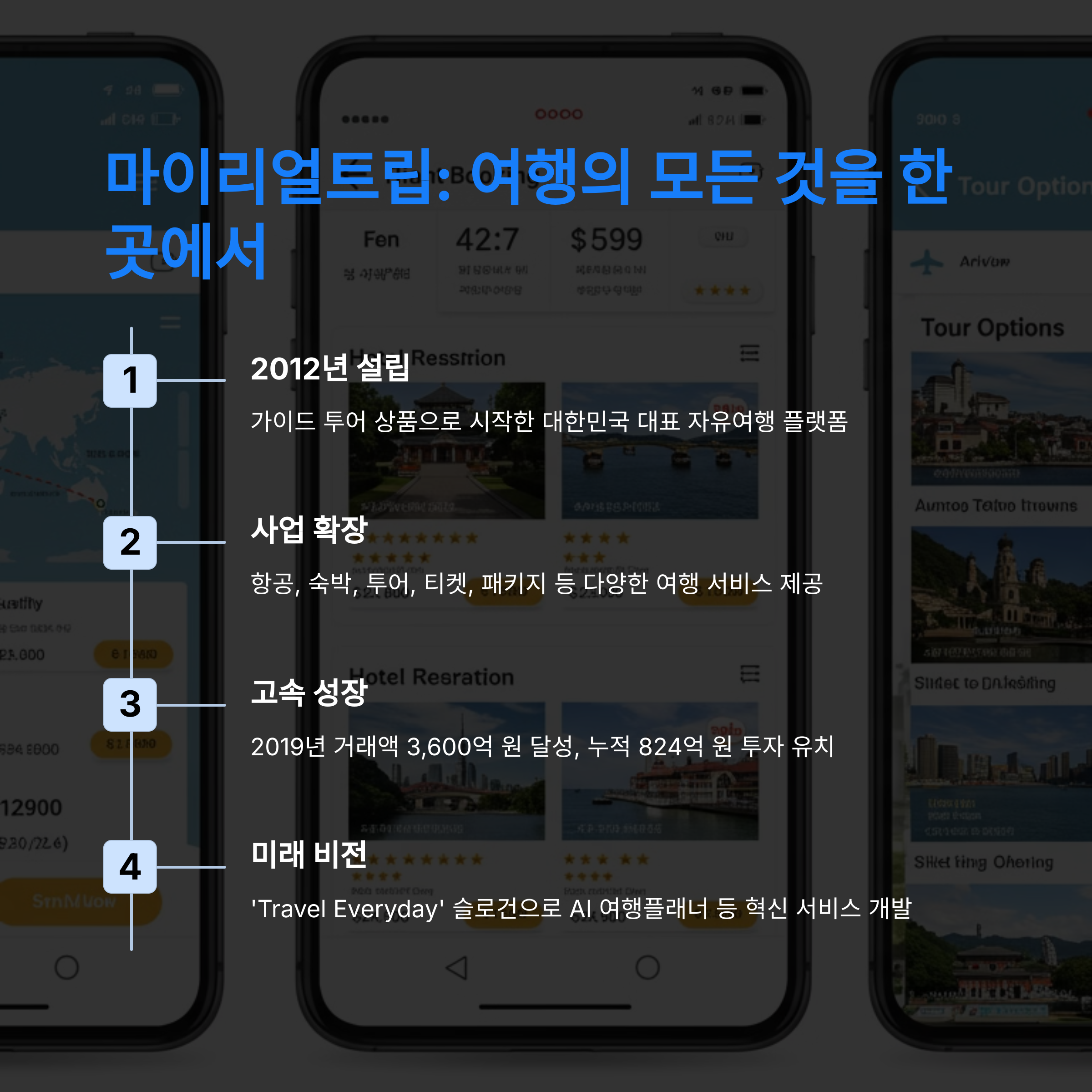 마이리얼트립은 2012년에 설립된 대한민국의 대표적인 자유여행 플랫폼으로, 여행 준비부터 항공, 숙박, 현지 교통, 투어, 티켓, 특가여행, 패키지 등 다양한 여행 서비스를 제공합니다. 설립 초기에는 현지 투어 상품을 소개하는 애플리케이션으로 시작하여, 이후 숙박, 항공, 투어, 패키지 등으로 사업 영역을 확장하며 여행의 모든 경험을 연결하는 슈퍼앱으로 성장하였습니다.