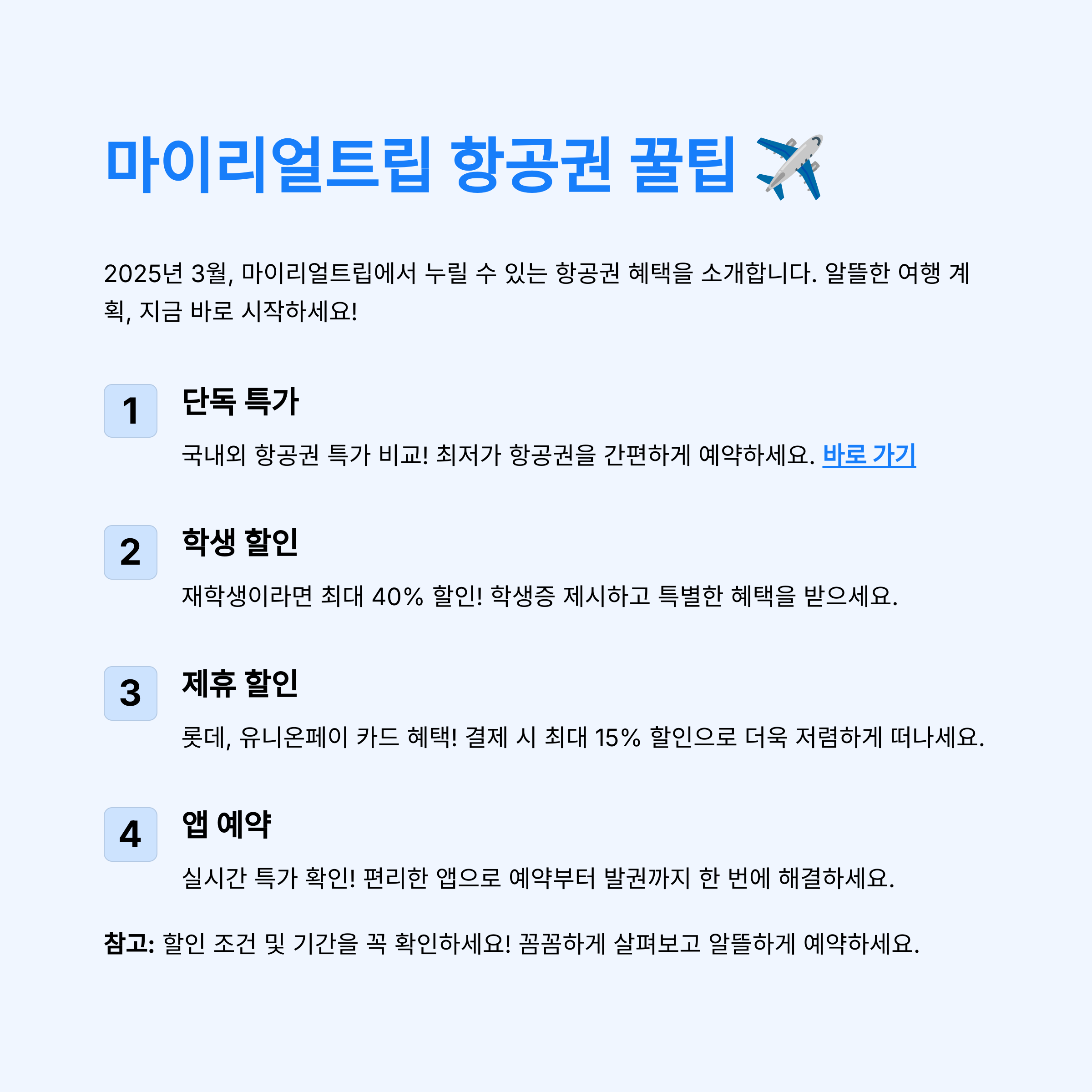 마이리얼트립은 2025년 3월을 맞아 다양한 항공권 프로모션과 할인 혜택을 제공하고 있습니다. 아래는 주요 혜택과 정보를 정리한 내용입니다: