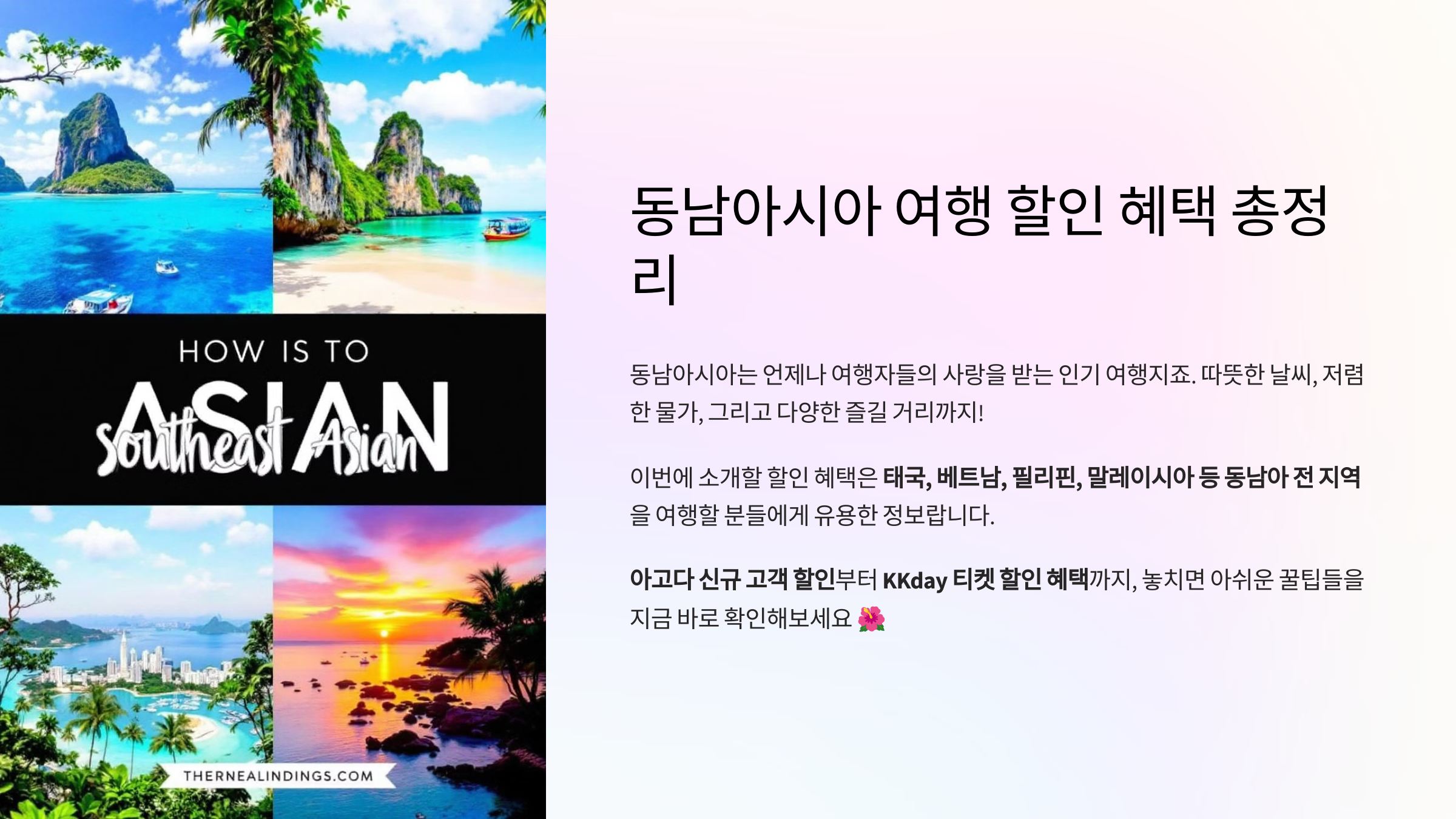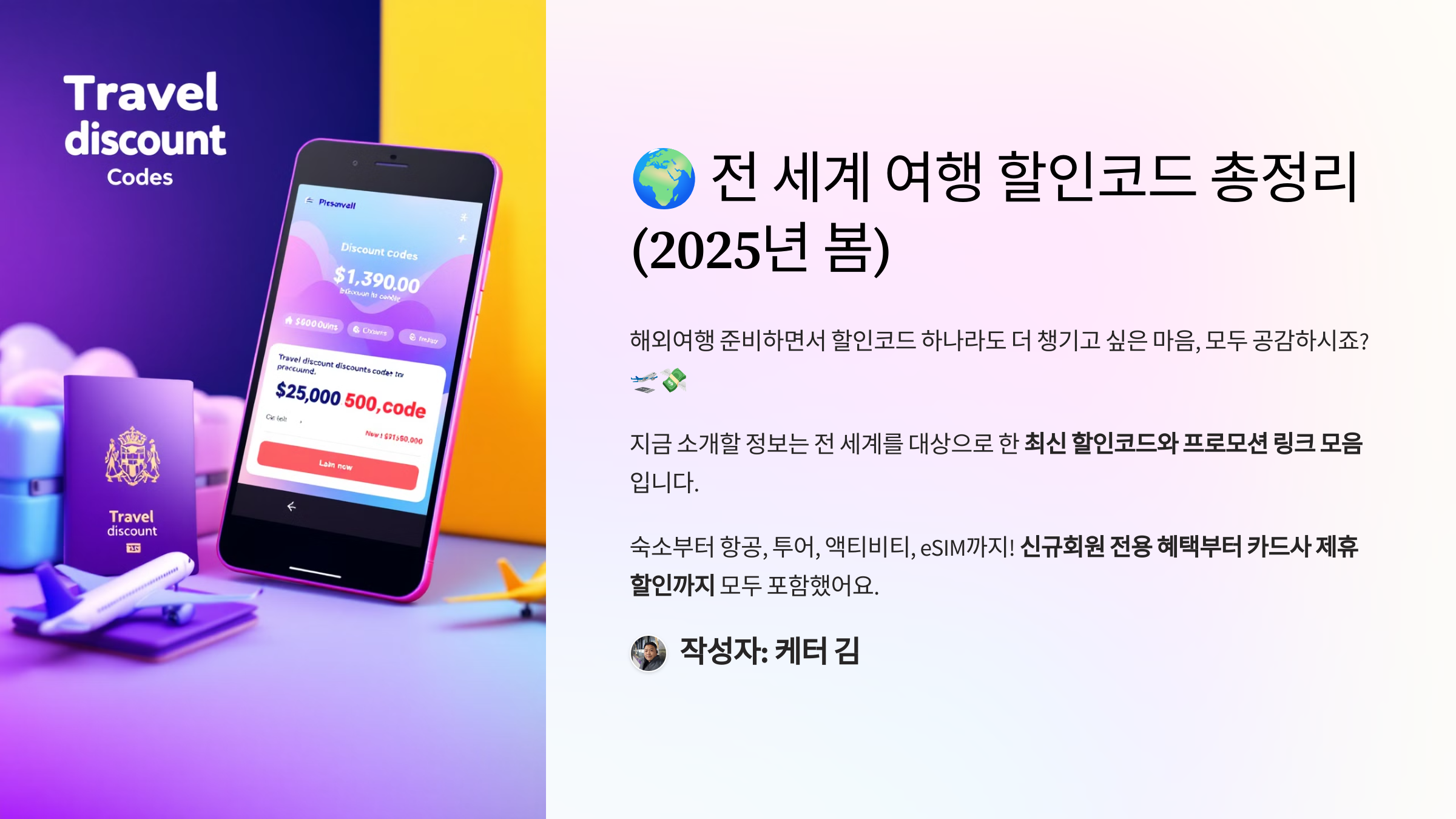 본 글은 광고를 포함하고 있습니다. 👍최신 할인코드 모음 사이트 : 할인코드.kr 해외여행 준비하면서 할인코드 하나라도 더 챙기고 싶은 마음, 모두 공감하시죠? 🛫💸지금 소개할 정보는 전 세계를 대상으로 한 최신 할인코드와 프로모션 링크 모음입니다. 숙소부터 항공, 투어, 액티비티, eSIM까지!신규회원 전용 혜택부터 카드사 제휴 할인까지 모두 포함했어요. 🧳 KKday 동남아/아시아 인기 티켓 & 액티비티 할인코드 추가✅ 동남아 인기 티켓/패스 할인 (2매 제공)1,000원 할인: 24KKSEA1 👉 바로가기5,000원 할인: 24KKSEA5 👉 바로가기10,000원 할인: 24KKSEA10 👉 바로가기✅ 푸꾸옥 썬월드 케이블카 전용 할인3000원 할인: 6RUA9CA 👉 바로가기혼똠..
